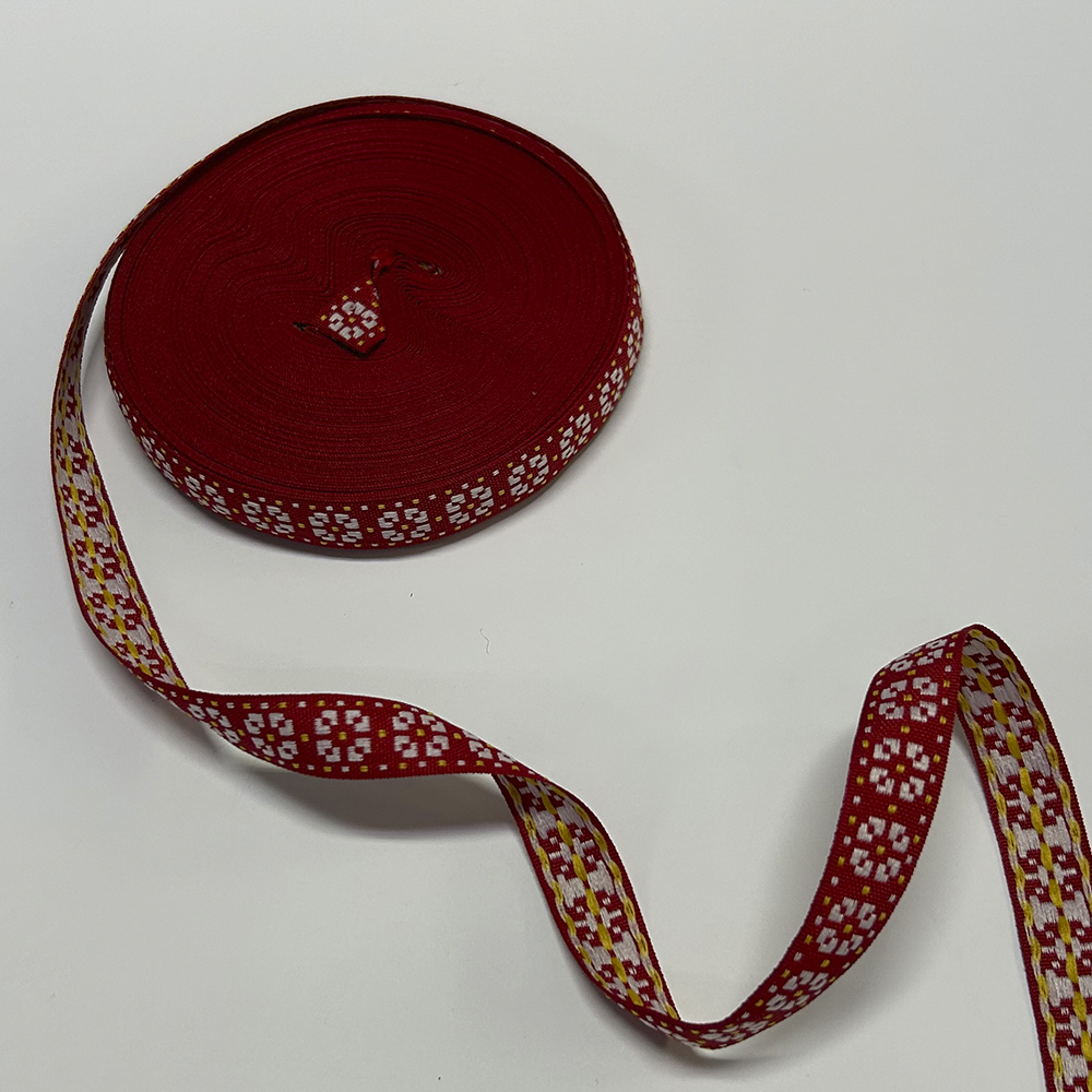 Стрічка оздоблювальна з орнаментом 1,8 см червона 06В13Г27. Страна производитель: . Отделочная тесьма с жаккардовым орнаментом используется для украшения одежды, декора элементов, отделки сумок, игрушек, различных аксессуаров в фольклорном стиле.