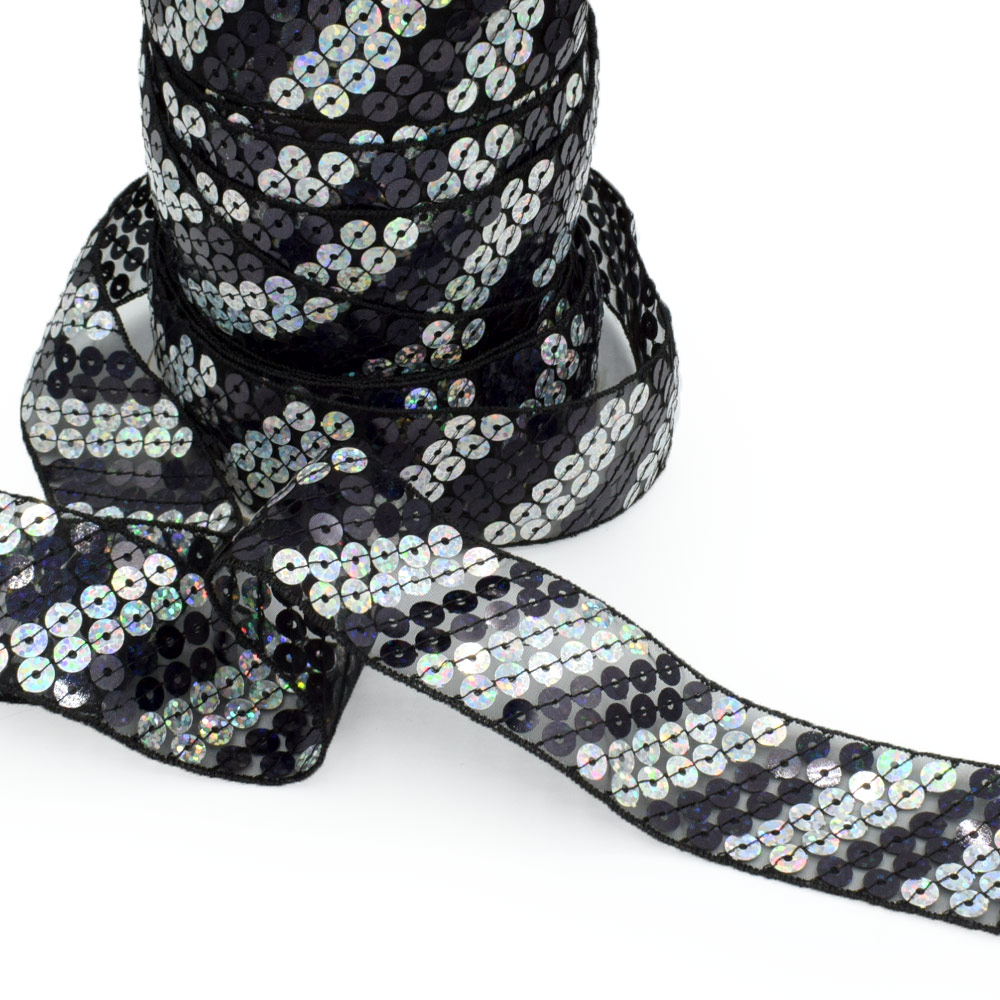 Тесьма с пайетками на капроне 40мм диагональ черно-серебристая купить в розницу и оптом