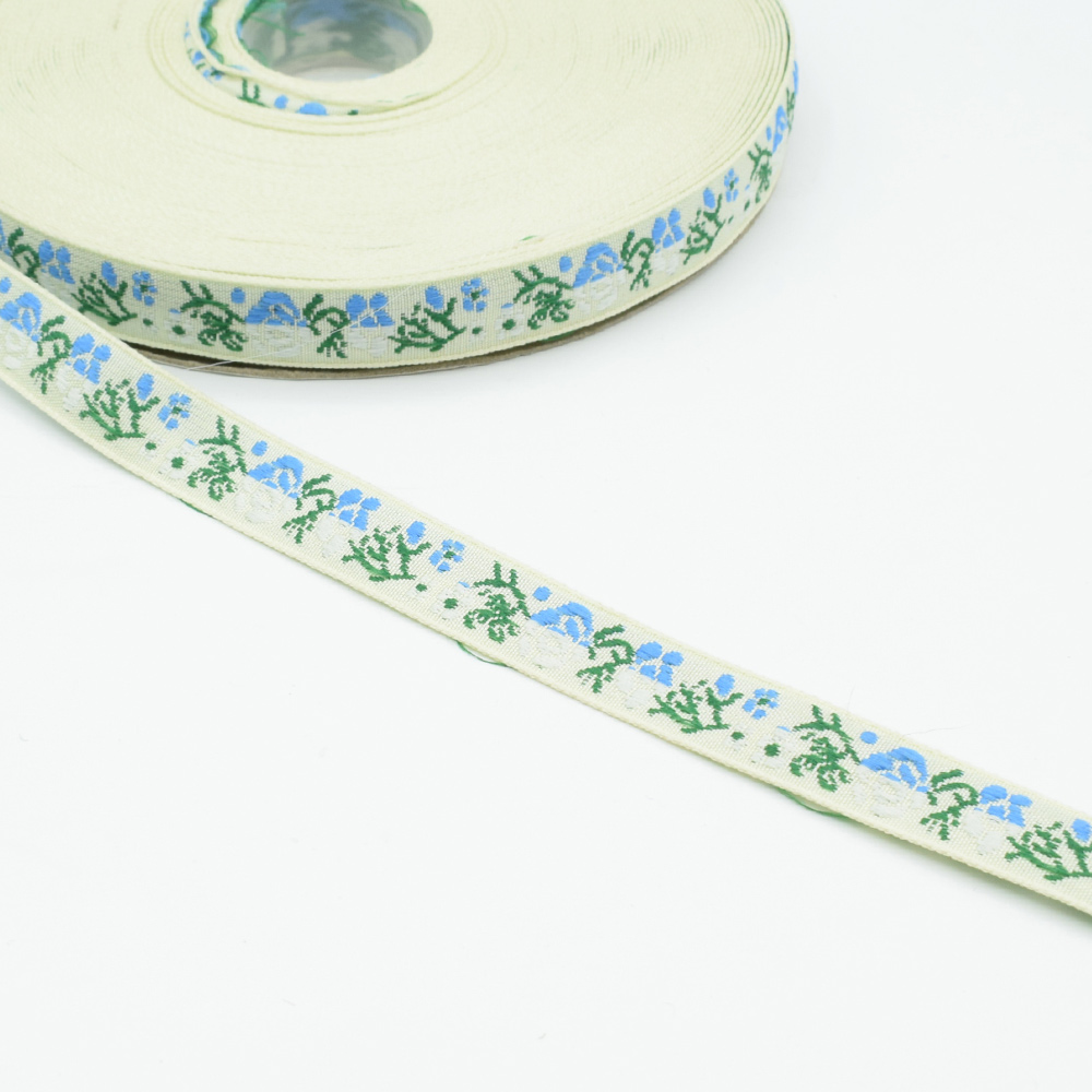 Тесьма жаккардовая орнамент цветочный голубой на белом. Страна производитель: Китай.