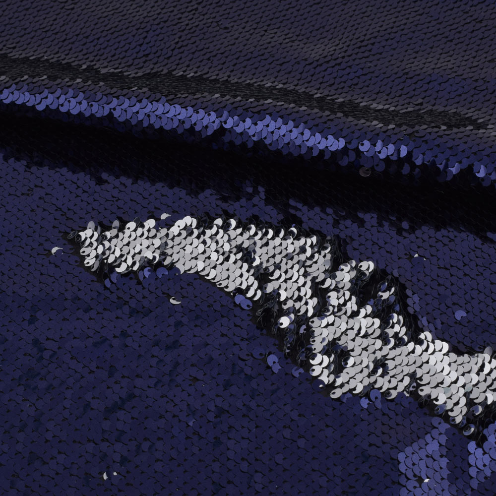 Пайетка двухсторонняя на атласе серебро/синяя темная, ш.130. Состав ткани: Полиэстер-100. Плотность ткани: 390 г/м.кв. Страна производитель: Южная Корея. Оригинальная ткань с двухсторонними пайетками - это роскошное полотно с 5-миллиметровыми блёстками, которые красиво пришиты на атласную ткань. Пайетки на этой ткани имеют две стороны, поэтому они меняют цвет, когда их перелистываешь. Этот уникальный цветовой эффект делает ткань яркой и универсальной. Основа из атласной ткани помогает достичь максимальной прочности ткани, поскольку волокна сохраняют свою первоначальную форму даже после растяжения. Ткань с двусторонними пайетками обычно используется для пошива платьев, костюмов - как для всего изделия, так и для декора. \ Двусторонние блестки ткани делают ее чрезвычайно интересной для сьемок, поскольку два цвета прекрасно контрастируют в объективе камеры.