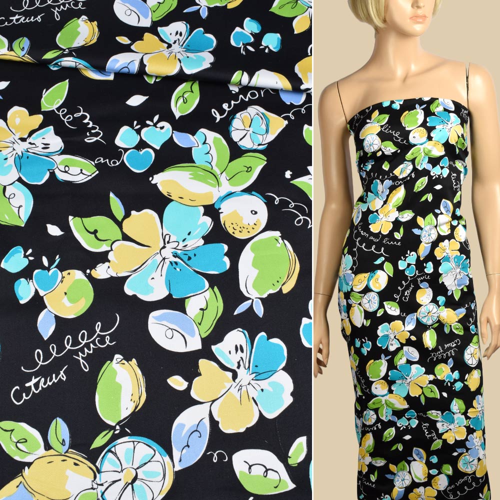 Коттон стрейч черный с желто-бирюзовыми цветами, ш.140 купить в розницу и оптом