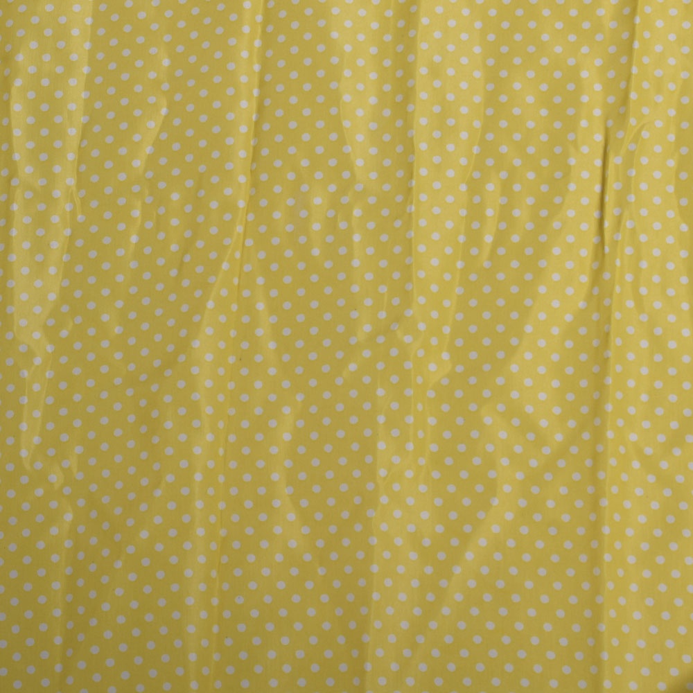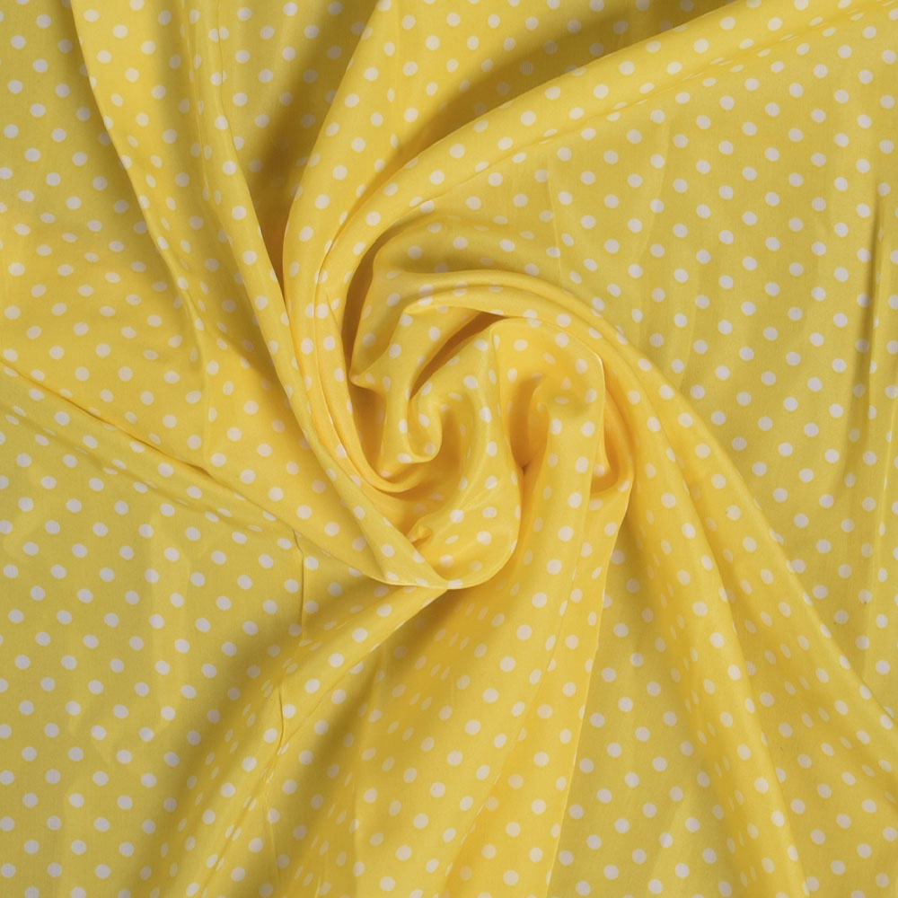 Купра диллон желтая в средний белый горох (уценка) ш.145. Состав ткани: Вискоза-20, Полиэстер-80. Плотность ткани: г/м.кв. Страна производитель: Южная Корея. шов и непоркрас, 0,6+1,3м