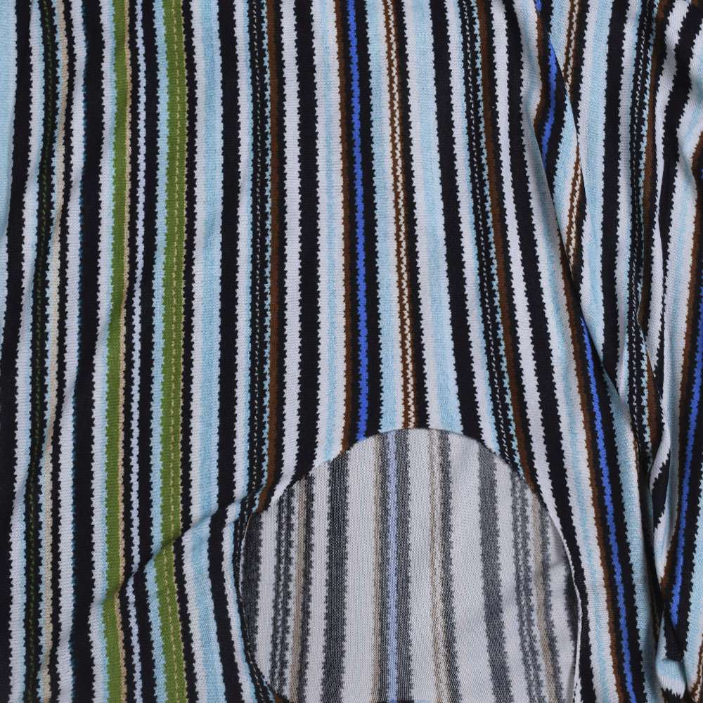 Трикотаж в разноцветные полоски зеленые, голубые, черно-белые (уценка) ш.160. Состав ткани: Полиакрил-85, Шерсть-10, Эластан-5. Плотность ткани: г/м.кв. Страна производитель: Южная Корея. Вырезанные круглые дыры, непрокрас - отсутствует 1-2 цвета в печати