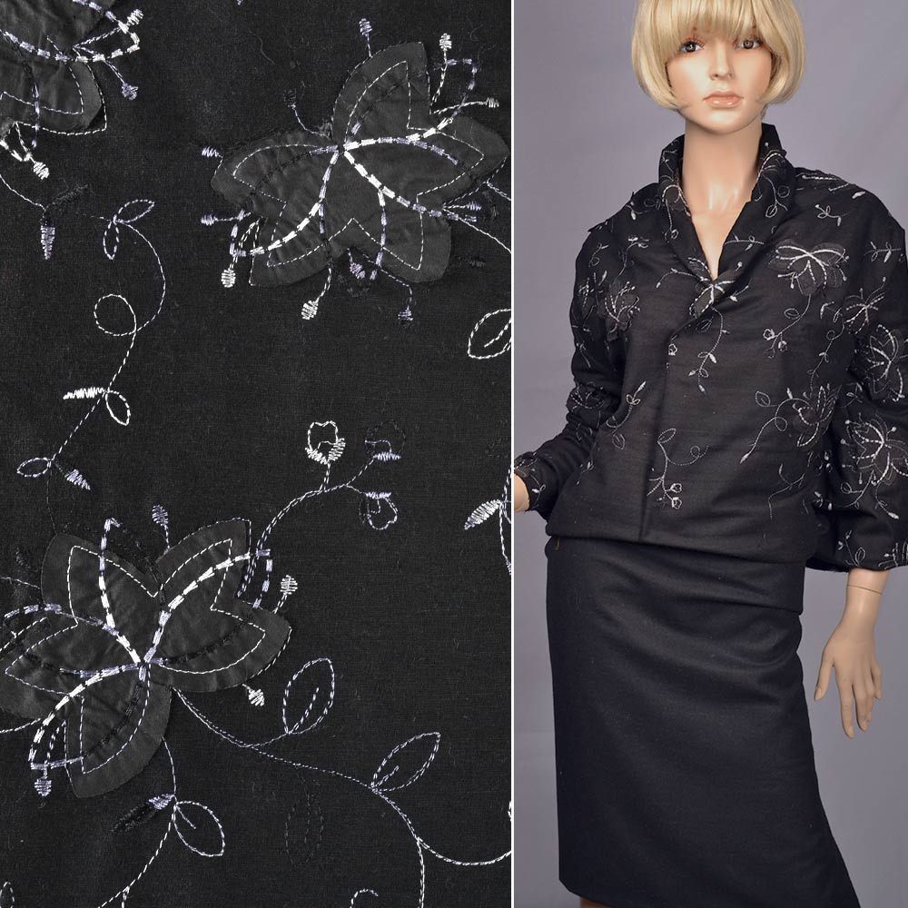 Ткань костюмная черная с серебряной вышивкой и черными аппликациями, ш.150. Состав ткани: Лавсан-15, Шерсть-85. Плотность ткани: 255 г/м.кв. Страна производитель: Южная Корея. Представляет собой плотное, гладкое полотно. Непрозрачная, держит форму. Материал хорошо пропускает воздух и имеет малую сминаемость. Ткань идеальна для жакета, платья-футляр, юбки-карандаш, брюк. Не мнётся, износоустойчива, не требует подкладочной ткани, отлично ложится в швах, из нее получаются красивые жакеты. Универсальна - для вечернего платья и для повседневного костюма.