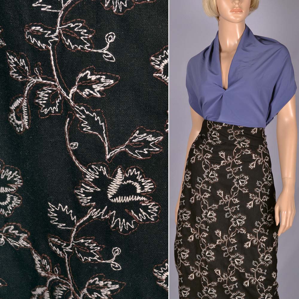 Ткань костюмная черная с вышитыми зигзагом белыми веточками, ш.150 купить в розницу и оптом