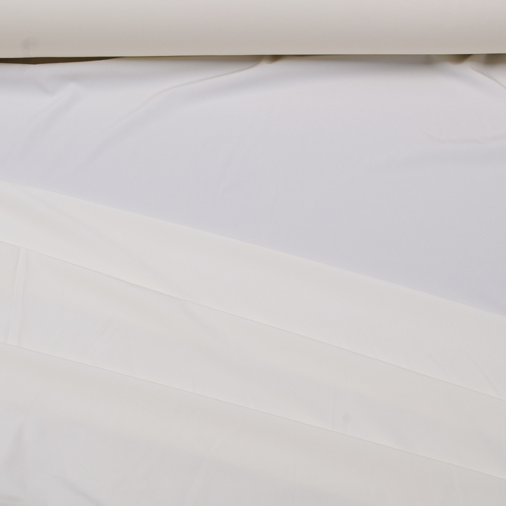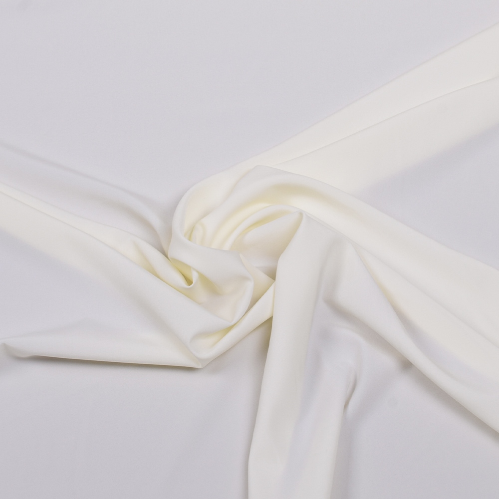 Биэластик гладкий молочно-кремовый ш.150. Состав ткани: Вискоза-40, Полиамид-23, Полиэстер-30, Эластан-7. Плотность ткани: 119 г/м.кв. Страна производитель: Южная Корея. Представляет собой плотное, гладкое полотно. Непрозрачная, держит форму. Материал хорошо пропускает воздух и имеет малую сминаемость. Ткань стрейчевая, что яляется большим примуществом в костюмной ткани, особенно для брюк, идеальна для облегающих изделий, для жакета, платья-футляр, юбки-карандаш. Не мнётся, износоустойчива, не требует подкладочной ткани, отлично ложится в швах, из нее получаются красивые жакеты. Универсальна - для вечернего платья и для повседневного костюма.
