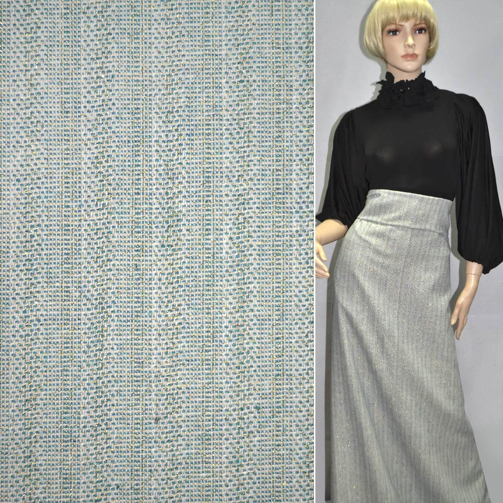 Твид бело-голубой с золотым люрексом ш.145. Состав ткани: Метанить-5, Полиакрил-15, Хлопок-30, Шерсть-50. Плотность ткани: 250 г/м.кв. Страна производитель: Южная Корея. Твид – это плотная, теплая и мягкая ткань. Используется для пошива костюмов, верхней одежды для мужчин и женщин. Обладает большим количеством положительных характеристик. Ткань приятна на ощупь, обладает элегантным внешним видом, характеризуется высокой прочностью и долговечностью, практически не мнется.