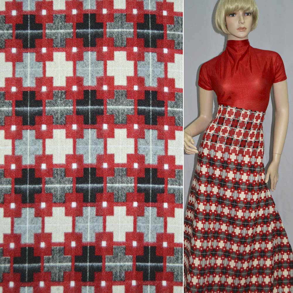 Жаккард костюмный красный с черными, серыми, бежевыми крестами ш.150 купить в розницу и оптом