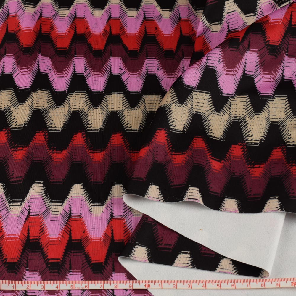 Ткань плащевая GERRY WEBER стрейч водоотталкивающая, красные, розовые зигзаги на черном фоне, ш.148 купить в розницу и оптом