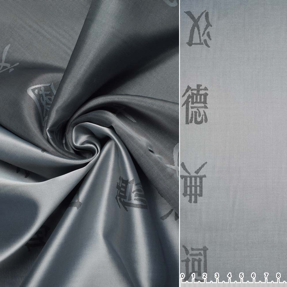 Вискоза жаккардовая серая в темные иероглифы ш.140. Состав ткани: Вискоза-50, Ацетат-50. Плотность ткани: 79 г/м.кв. Страна производитель: Германия. Блестящая фактурная ткань отлично подходит для пошива подклада у самых разнообразных изделий. Лицевая сторона ткани фактурная, с узором, изнаночная сторона — матовая. Блестящий материал приятен на ощупь и напоминает прохладную воду.