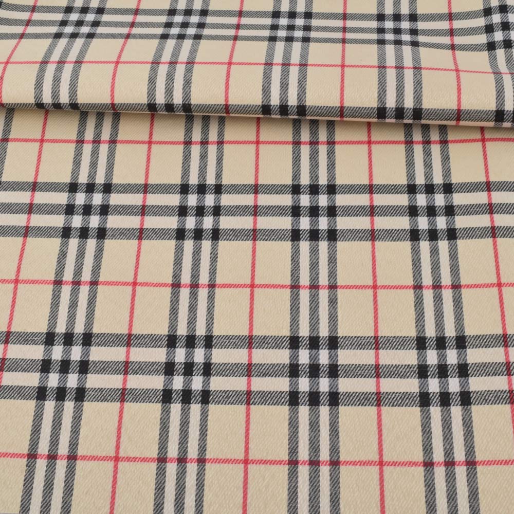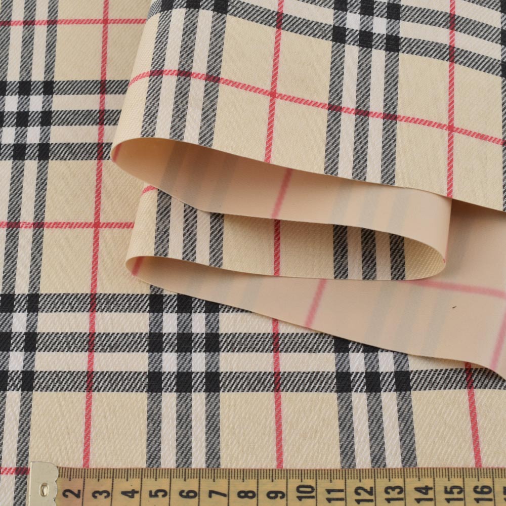 Ткань ПВХ кремовая в черно-красную клетку, ш.150. Состав ткани: Полиуретан-30, Полиэстер-70. Плотность ткани: 393 г/м.кв. Страна производитель: Южная Корея. Ткань ПВХ - это прочный, гладкий материал, очень плотный. Благодаря особому плетению, обладает износостойкостью и водоотталкивающим свойством. Устойчива к загрязнениям. Используется для пошива спецодежды, обуви, сумок, рюкзаков, различных акссесуаров для походов, палаток, спальных мешков, тентов и многого другого.¶¶