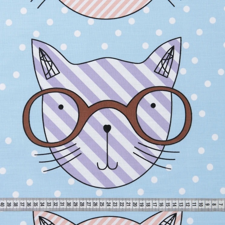 Бязь набивная голубая, коты в очках, ш.220 купить в розницу и оптом
