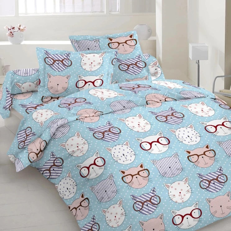 Бязь набивная голубая, коты в очках, ш.220, Хлопок-52, Полиэстер-48, ш.220, п/п 118, Страна производитель: Пакистан. Бязь - легкая, гигроскопичная, прочная, шлифованная ткань. Высокая степень обработки нити делает материал гладким и приятным на ощупь, очень прочным и износостойким, устойчивым к деформации и выгоранию. Выдерживает большое количество стирок, сохраняя свой внешний вид и характеристики.
