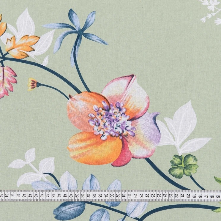 Бязь набивная серо-зеленая, оранжево-розовые цветы, ш.220 купить в розницу и оптом