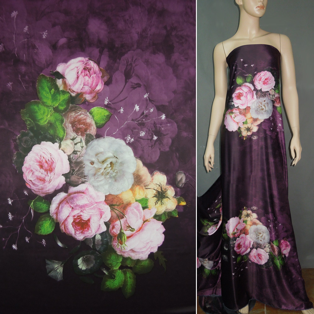 Атлас шелковый фиолетовый с молочно-розовыми букетами цветов ш.150. Состав ткани: Полиэстер-73, Шелк-20, Эластан-7. Плотность ткани: 76 г/м.кв. Страна производитель: Южная Корея. Ткань атлас по описанию относится к разновидностям шелка (полушелка). Отличительной особенностью полотна является специальное плетение, называемое атласным. Гладкость лицевой стороны обеспечивает то, что продольные нити чередуются с основой в определённой последовательности. Уток выходит на лицо ткани через 5-6 нитей основы.