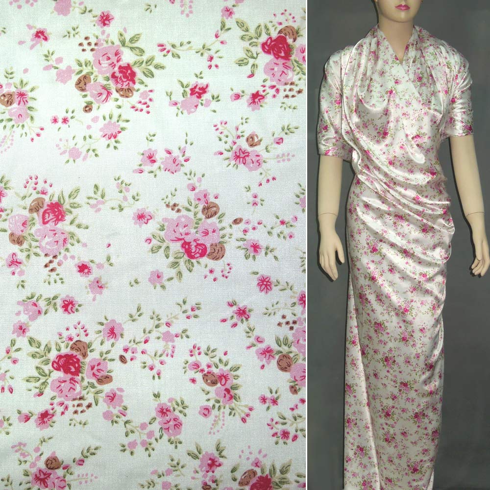 Атлас стрейч белый в мелкие розовые цветы ш.150 купить в розницу и оптом
