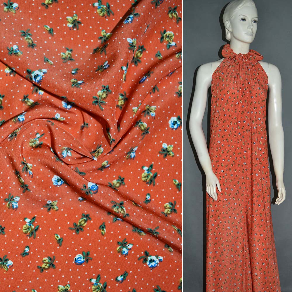 Купра диллон красно-оранжевый с цветами и белыми точками ш.150. Состав ткани: Вискоза-20, Полиэстер-80. Плотность ткани: 72 г/м.кв. Страна производитель: Южная Корея. Купра - мягкий и шелковистый материал. Он легкий и приятный к телу. Ткань гигроскопичная и пропускает воздух. В одежде из купры будет комфортно находиться на протяжении всего дня. Материал выглядит дорого и качественно, за счет атласного блеска. Ткань образует мягкие драпировки.
