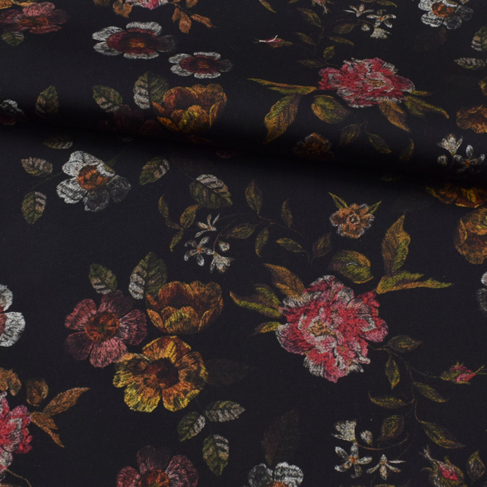 Коттон стрейч черный, розовые, оранжевые цветы, ш.127 купить в розницу и оптом
