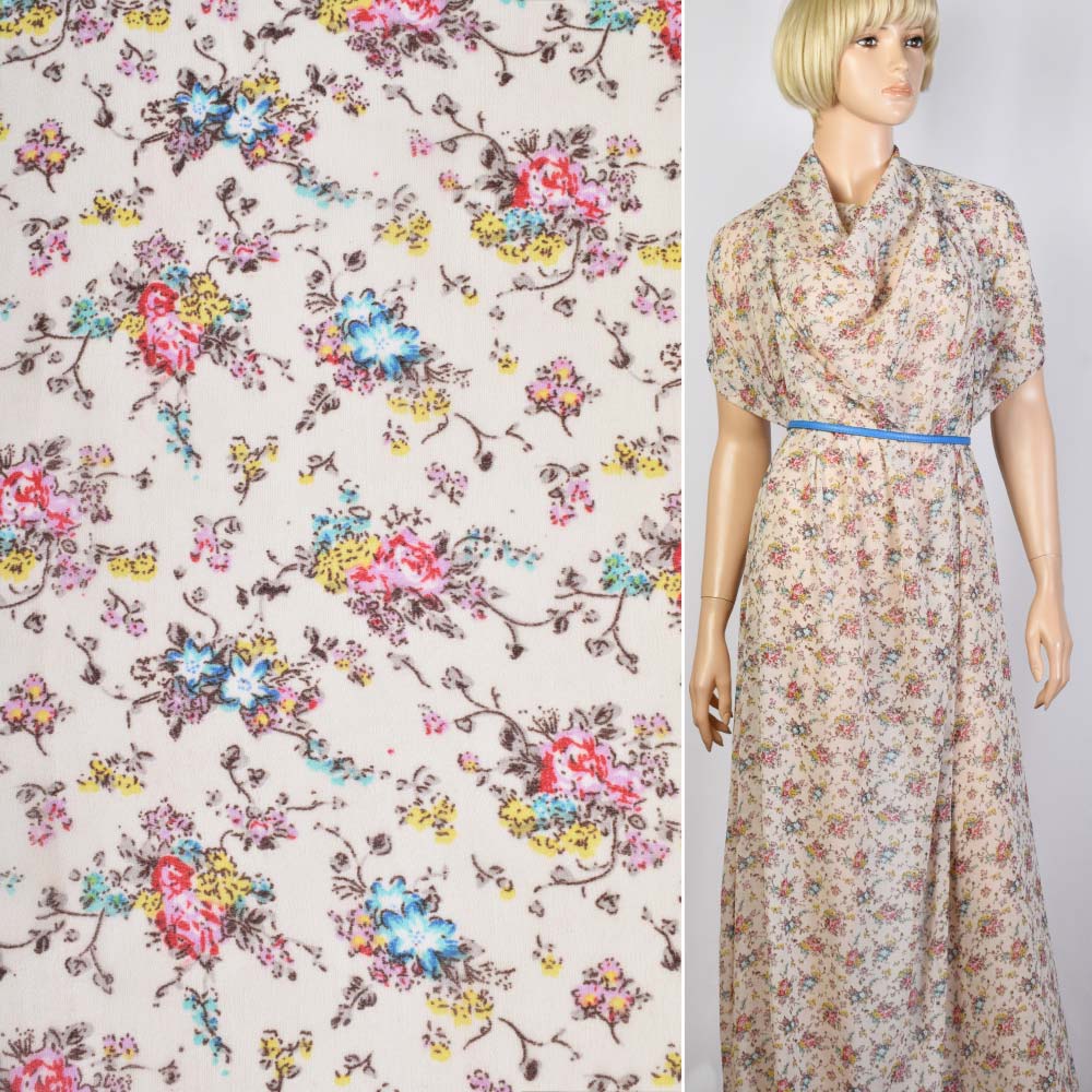 Креп-шифон молочный в розовые, голубые цветы ш.150 купить в розницу и оптом