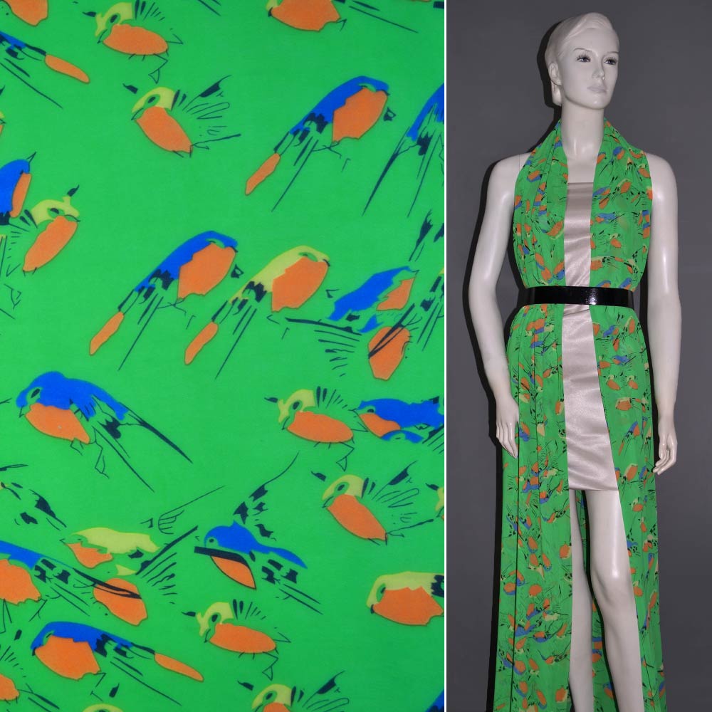 Креп-шифон зеленый с попугаями ш.151 купить в розницу и оптом