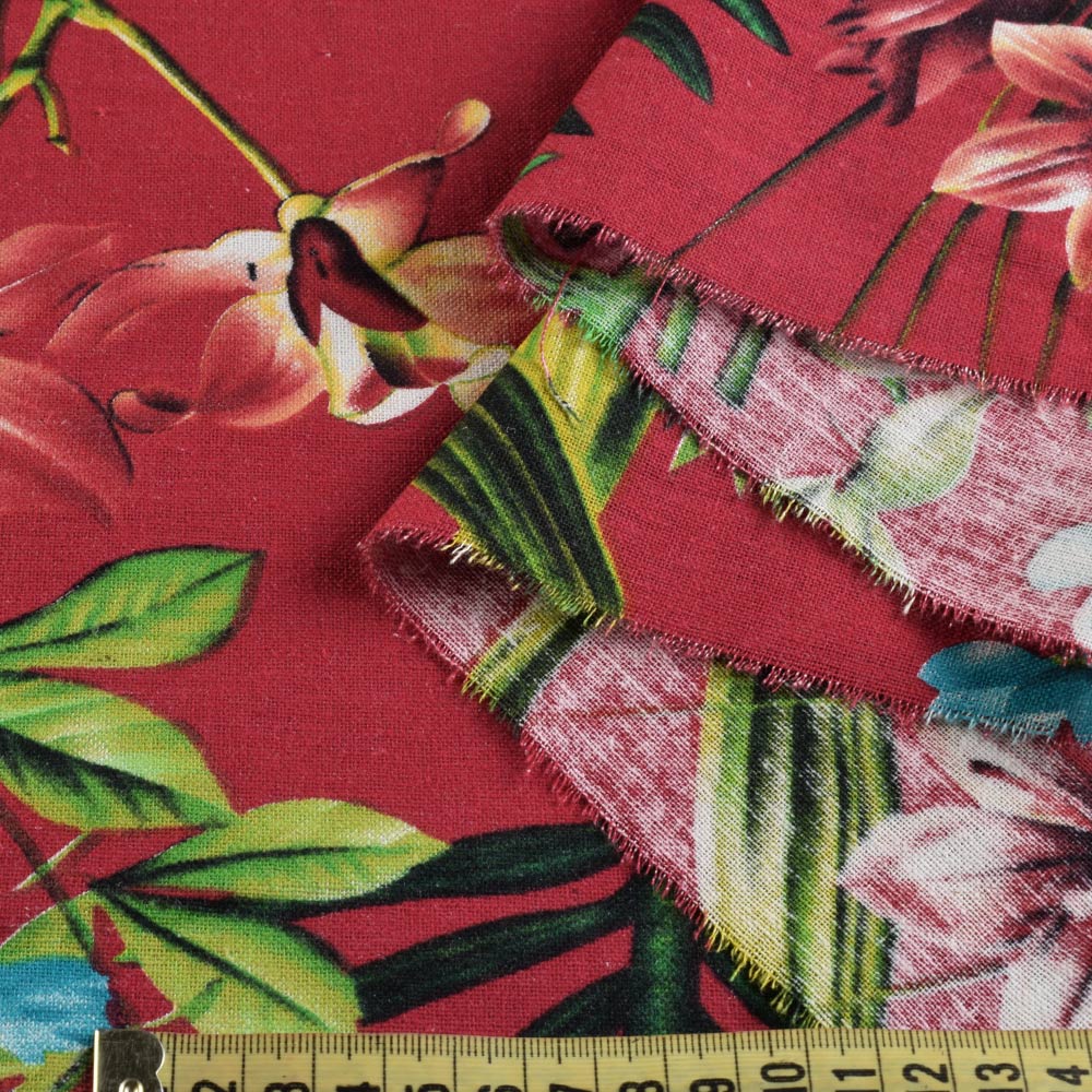 Лен красный, оранжевые лилии, зеленые листья, ш.150. Состав ткани: Лён-70, Хлопок-30. Плотность ткани: 141 г/м.кв. Страна производитель: Южная Корея. Лен - материал средней плотности, натурального происхождения, используется для пошива летних изделий. Гигроскопичный, воздухопроницаемый, прочный, устойчив к носке, стирке и глаженью. Поверхность ткани матовая, а благодаря хлопку в составе, тактильно очень мягкая и приятная на ощупь, непрозрачна. В складках и сборках не имеет значительного формообразования, ложится мягко и пластично. Подходит для пошива брючных костюмов свободного кроя, пиджаков, платьев, юбок, сарафанов, рубашек.