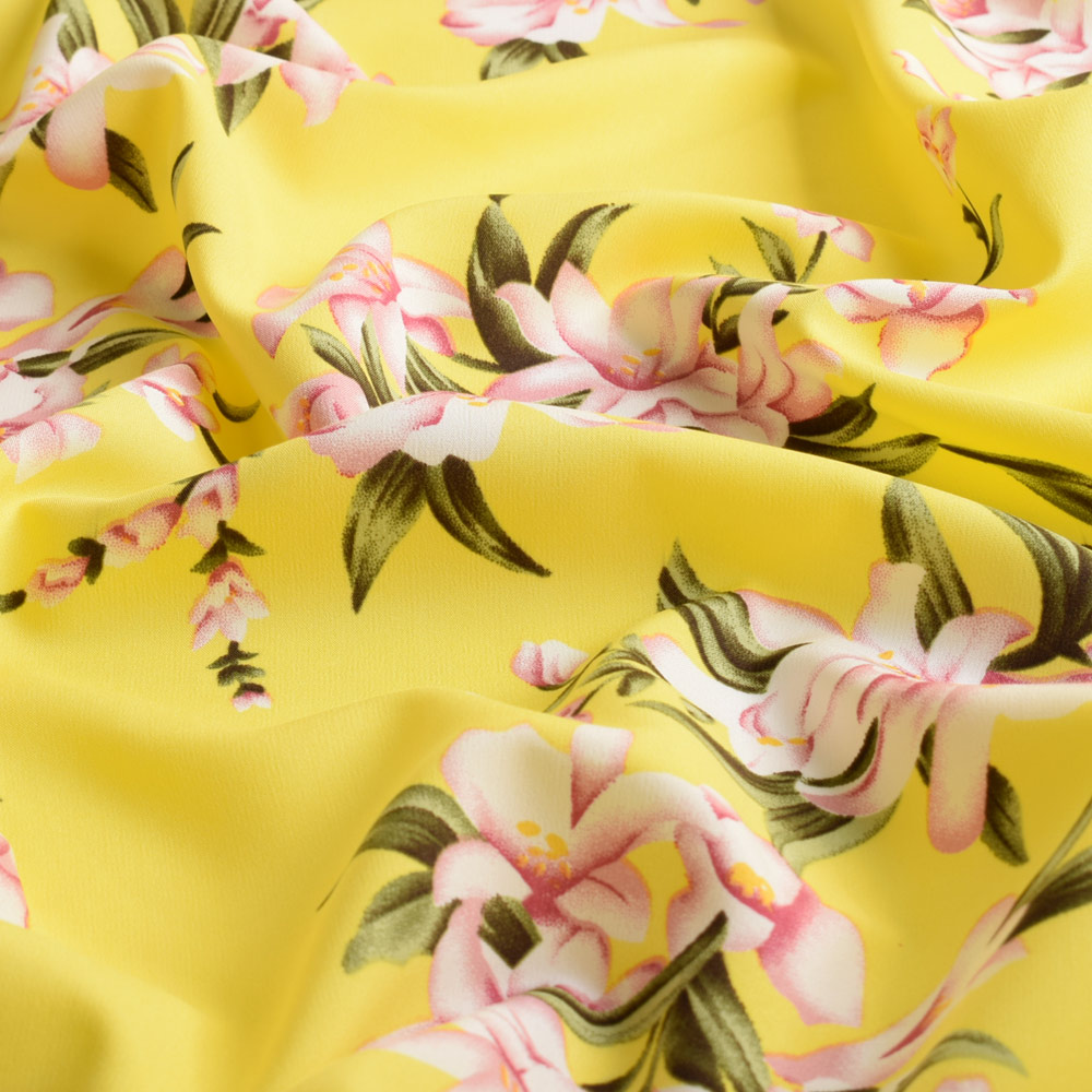 Поплин лимонный, розовые лилии, ш.150. Состав ткани: Полиэстер-100. Плотность ткани: 78 г/м.кв. Страна производитель: Южная Корея. Поплин представляет собой гладкий, воздушный, приятный на ощупь, нежный материал. В жаркое время в одежде из поплина будет комфортно, так как ткань обладает отличной воздухопроницаемостью. Ткань приятно лежит на теле, не раздражает чувствительную кожу. Она хорошо кроится, легко шьется, изделия из неё хорошо сохраняют форму. Используется для изготовления летних платьев, блуз, женского и детского белья, мужских сорочек и т. д. Несмотря на легкость и тонкость, вещи из поплина отлично сохраняют форму.