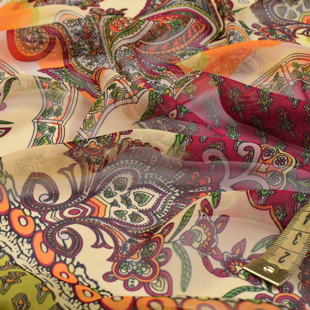 Шифон кремовый в вишнево-оранжевый орнамент, 2ст. купон, ш.150 купить в розницу и оптом