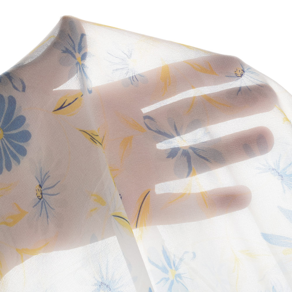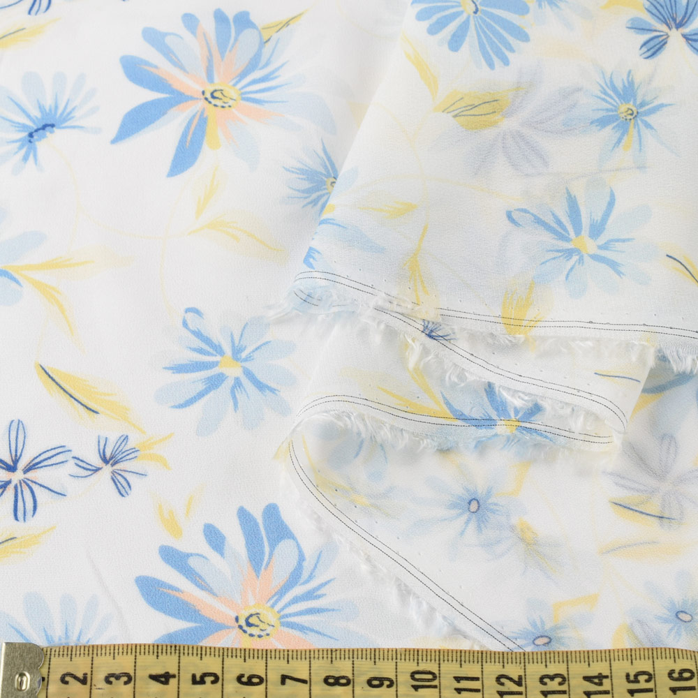 Креп-шифон вискозный белый в сине-голубые цветы, желтые перышки, ш.134. Состав ткани: Вискоза-100. Плотность ткани: 62 г/м.кв. Страна производитель: Германия. Лицевая сторона материи имеет выраженный рельефный рисунок, а изнаночная может быть гладкой и очень приятной к телу или аналогичной с лицевой. Красивый шероховатый узор образуется благодаря уникальному плетению нитей полотна. Изделия из этой материи идеально садятся по фигуре. Креп практически не мнется, устойчив к износу и практичен. Это хорошо тянущаяся ткань, которая прекрасно восстанавливает форму. Данные свойства позволяют использовать креп при изготовлении разнообразной одежды.