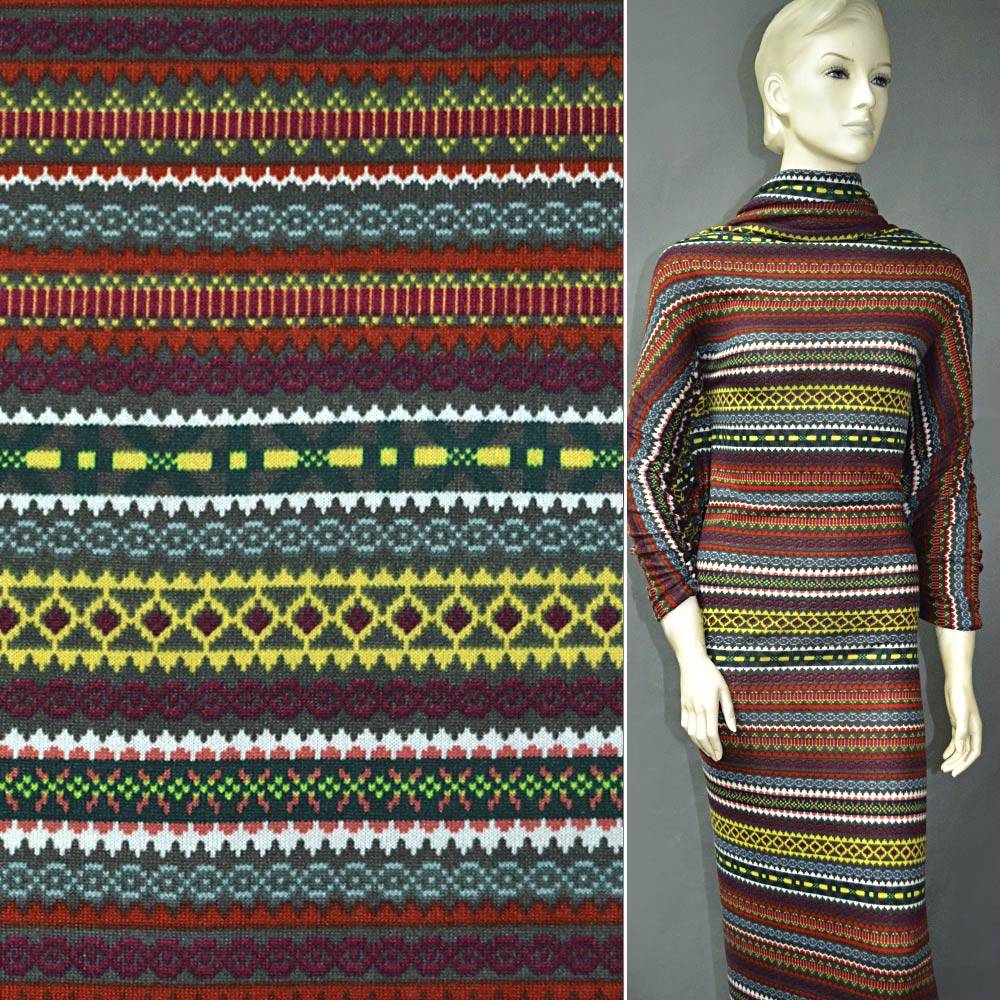 Трикотаж в бордово-серые, зелено-красные полоски с желтым орнаментом ш.165 купить в розницу и оптом