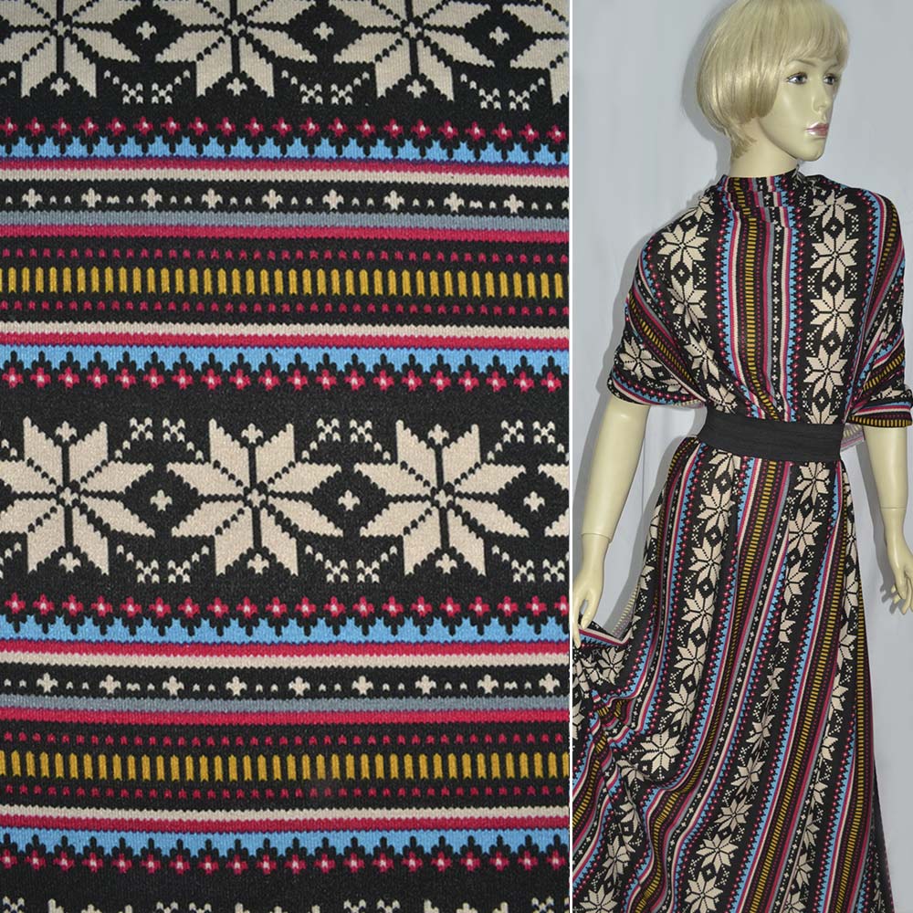 Трикотаж c шерстью в черно-голубые полосы с цветочным орнаментом ш.165 купить в розницу и оптом