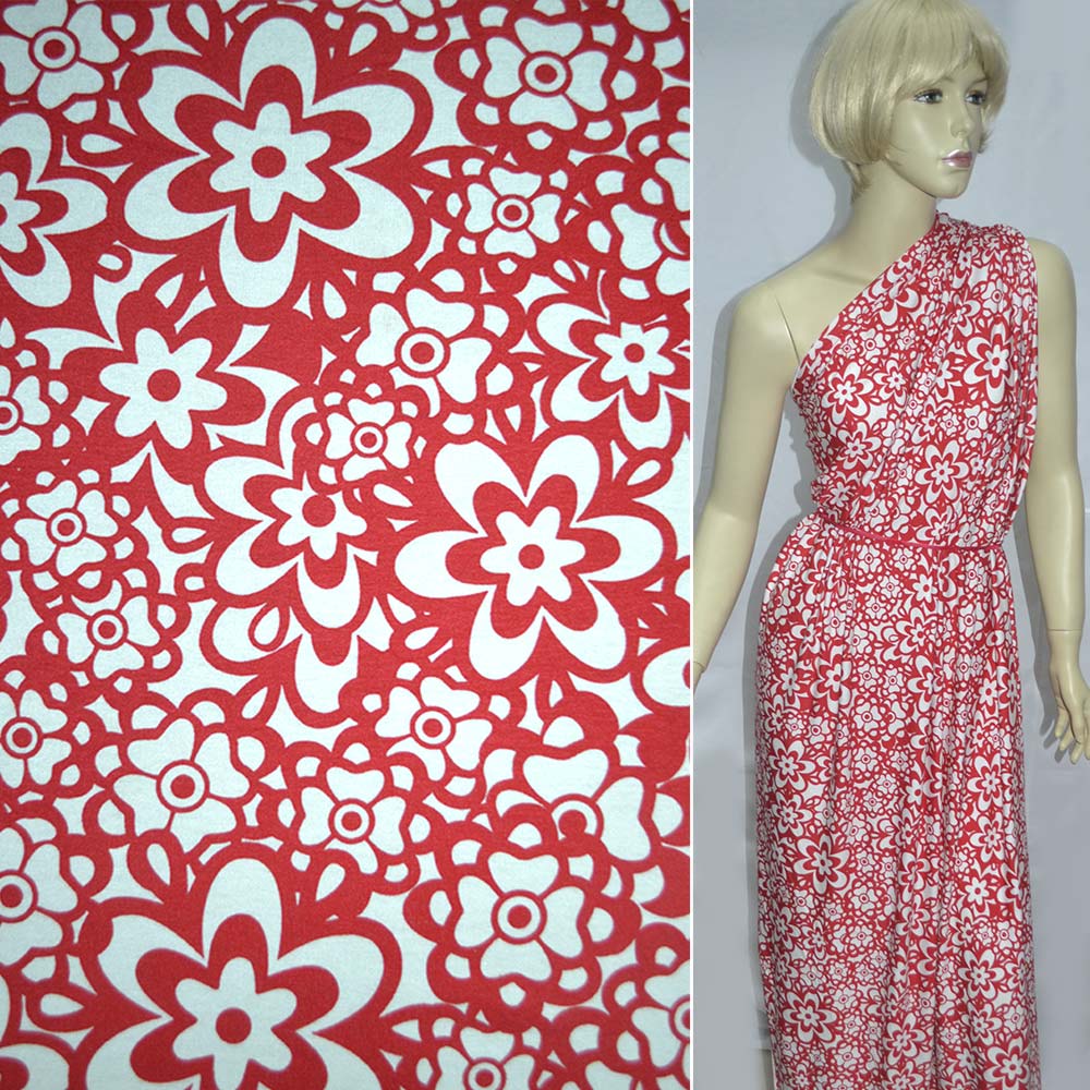 Трикотаж вискозный стрейч белый с красными ромашками ш.130. Состав ткани: Вискоза-96, Эластан-4. Плотность ткани: 197 г/м.кв. Страна производитель: Германия. Трикотаж - это мягкая плотная материя, не прозрачная. Приятная на ощупь, комфортная в носке. Благодаря содержанию синтетических материй, материал более износостойкий и надолго сохраняет свой первоначальный вид. Ткань отличается своей приятной текстурой, хорошей растяжимостью, практически не мнется. Трикотаж достаточно простой в уходе. Используется для пошива платьев, спортивных костюмов, легких жакетов, поло, футболок и многого другого.