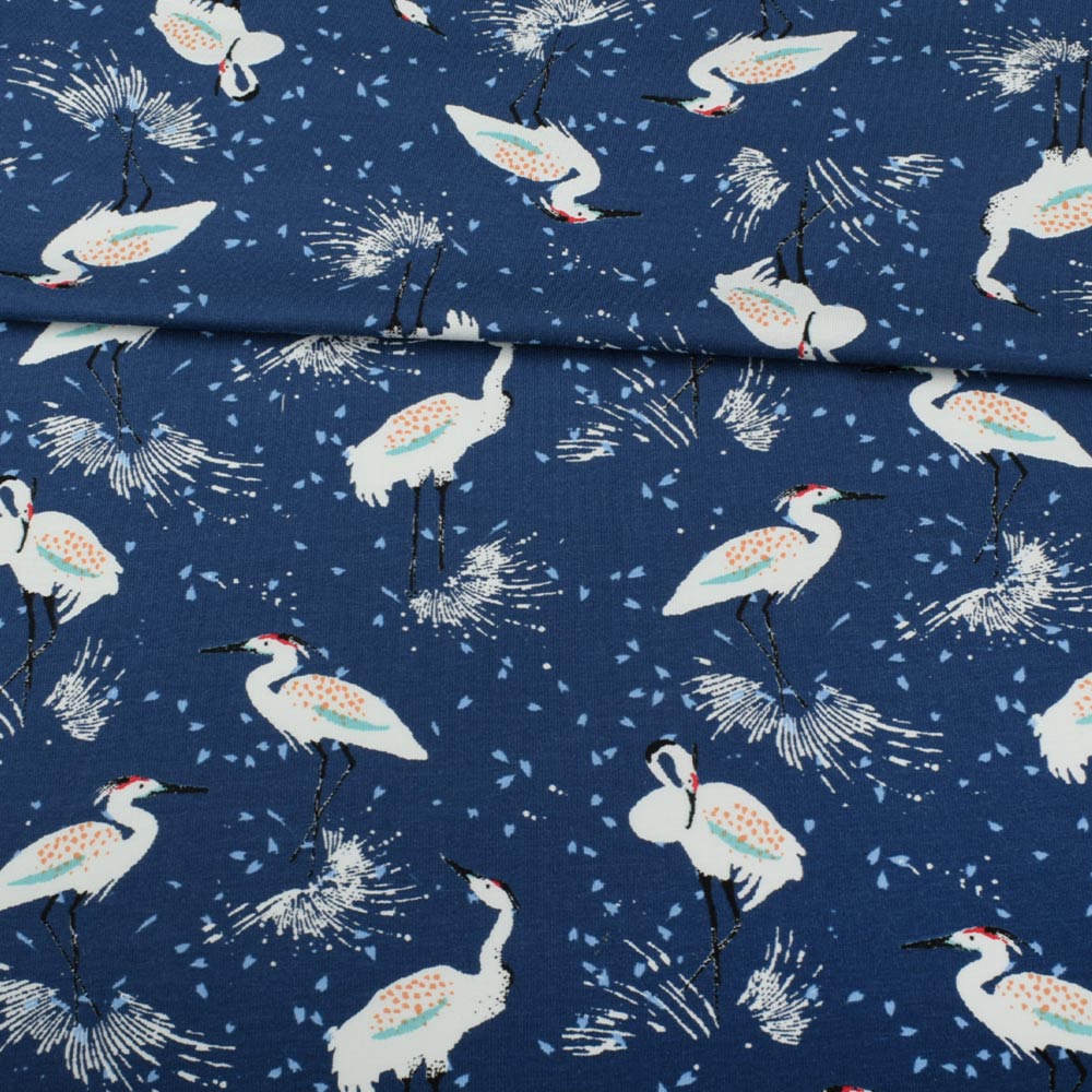 Трикотаж бавовна синій, білі журавлі, ш.150. Склад тканини: Бавовна-95, Еластан-5. Щільність тканини 190 г/м.кв. Країна виробник: Німеччина. Трикотаж – це м'яка щільна матерія, не прозора. Приємна на дотик, комфортна в носінні. Завдяки вмісту синтетичних матерій, матеріал більш зносостійкий та надовго зберігає свій первісний вигляд. Тканина відрізняється своєю приємною текстурою, гарною розтяжністю, практично не помається, добре драпірується. Трикотаж досить простий у догляді. Використовується для пошиття суконь, спортивних костюмів, легких жакетів, поло, футболок та багато іншого.Дякуємо за ваш вибір.