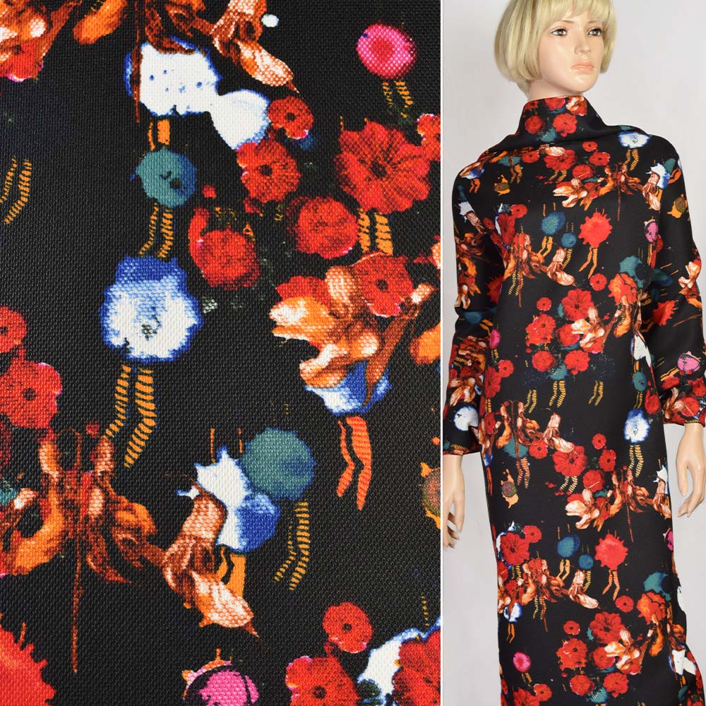 Рогожка чорна в червоні і помаранчеві квіти, ш.150. Склад тканини: Акрил-30, Поліестер-70. Щільність тканини 270 г/м.кв. Країна виробник: Південна Корея. Жаккардом називають тканини з великим рельєфним візерунком та складним плетінням. Щільний малюнок ниток у товщі матерії забезпечує видатну міцність жаккарда на розрив: вироби без проблем переживають прання машини, хімчистку, використання миючих засобів. Відрізняється порівняно легкою схемою догляду, здатністю чинити опір проникненню вологи. Тому оббивка більшої частини меблів в готелях і ресторанах виконується з котону жаккардового плетіння. Полотно зберігає свої властивості в широкому діапазоні температур, тому його використання можливе для прикрашання приміщень, що не опалюються взимку. Застосовується при виготовленні декоративних предметів з текстилю, як оббивний матеріал або тканина для виготовлення одягу.Дякуємо за ваш вибір.