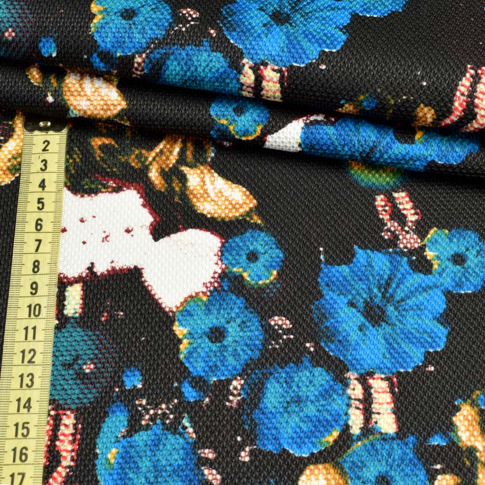 Рогожка чорна в сині і бежеві квіти, ш.150. Склад тканини: Акрил-30, Поліестер-70. Щільність тканини 265 г/м.кв. Країна виробник: Південна Корея. Жаккардом називають тканини з великим рельєфним візерунком та складним плетінням. Щільний малюнок ниток у товщі матерії забезпечує видатну міцність жаккарда на розрив: вироби без проблем переживають прання машини, хімчистку, використання миючих засобів. Відрізняється порівняно легкою схемою догляду, здатністю чинити опір проникненню вологи. Тому оббивка більшої частини меблів в готелях і ресторанах виконується з котону жаккардового плетіння. Полотно зберігає свої властивості в широкому діапазоні температур, тому його використання можливе для прикрашання приміщень, що не опалюються взимку. Застосовується при виготовленні декоративних предметів з текстилю, як оббивний матеріал або тканина для виготовлення одягу.Дякуємо за ваш вибір.