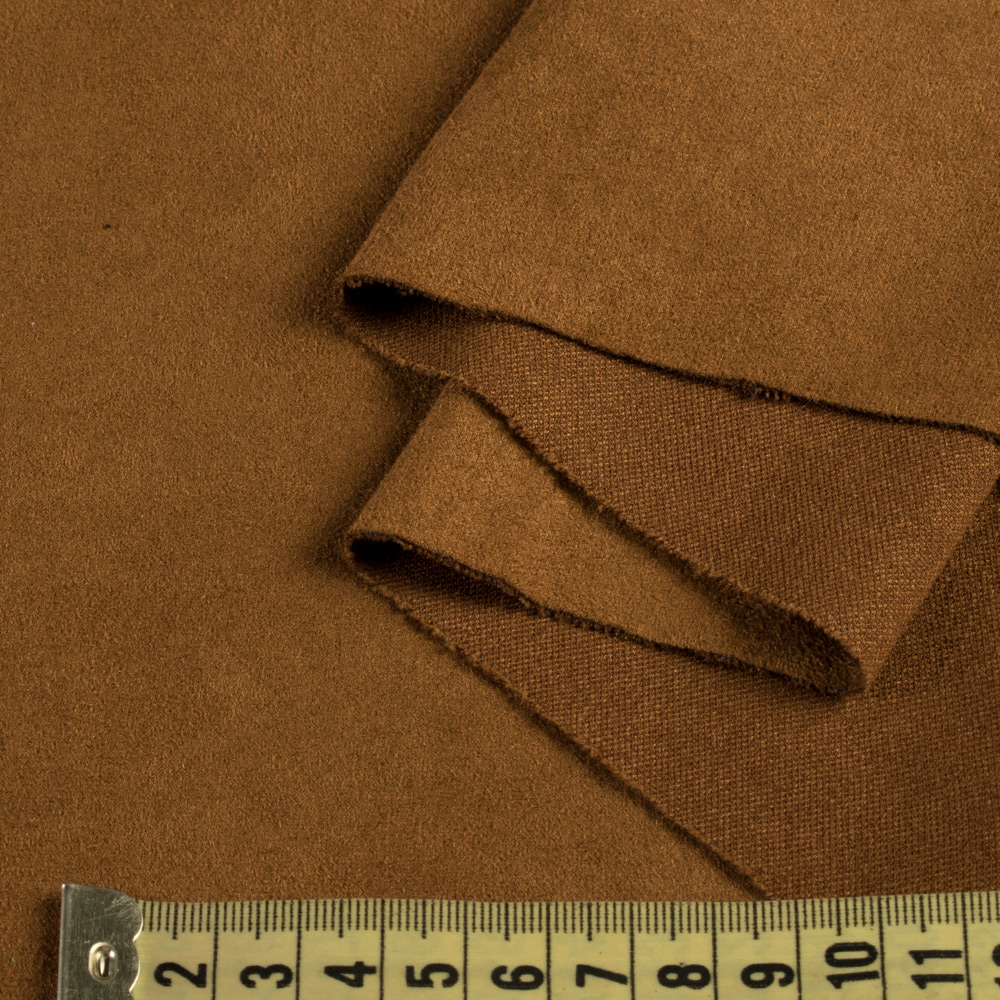 Замша стрейч коричнева, ш.145. Склад тканини: Поліакріл-50, Поліестер-42, Еластан-8. Щільність тканини 198 г/м.кв. Країна виробник: Південна Корея. Замша штучна – це м'який бархатистий матеріал. З лицьового боку вкрита коротким ворсом, на дотик дуже приємна та ніжна. Тканина добре драпірується, утворює гарні складки та волани. Стрейчева, пружна, добре тримає форму. Вона зносостійка, стійка до вицвітання, завдяки спеціальному покриттю перешкоджає проникненню бруду всередину волокна. Чи не накопичує статичну електрику. На відміну від натуральної замші відсутні злами, подряпини, інші дефекти.