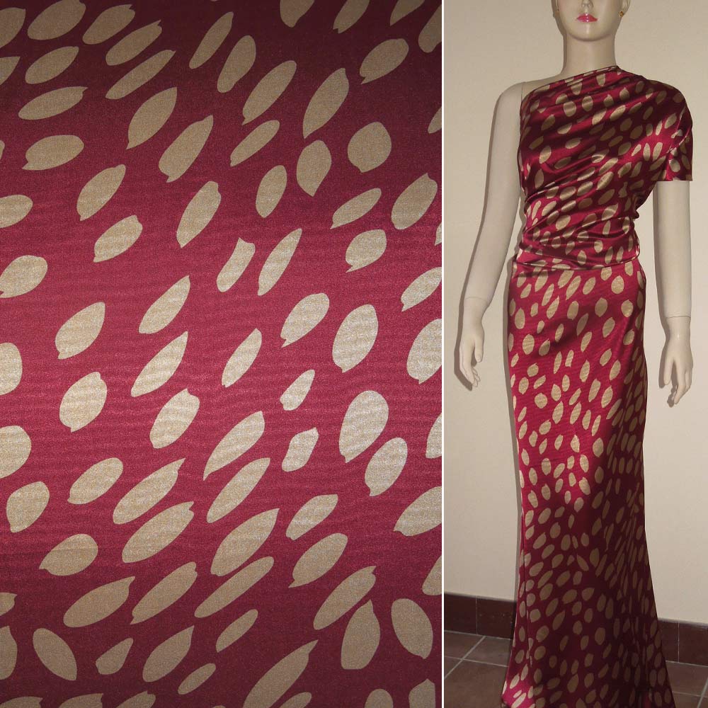 Атлас стрейч вишневий в бежеві овали ш.150. Склад тканини: Поліестер-97, Еластан-3. Щільність тканини 97 г/м.кв. Країна виробник: Південна Корея. Тканина атлас за описом відноситься до різновидів шовку (напівшовку). Відмінною особливістю полотна є спеціальне плетіння, яке називається атласним. Гладкість лицьової сторони забезпечує те, що поздовжні нитки чергуються з основою певної послідовності. Качок виходить на обличчя тканини через 5-6 ниток основи.