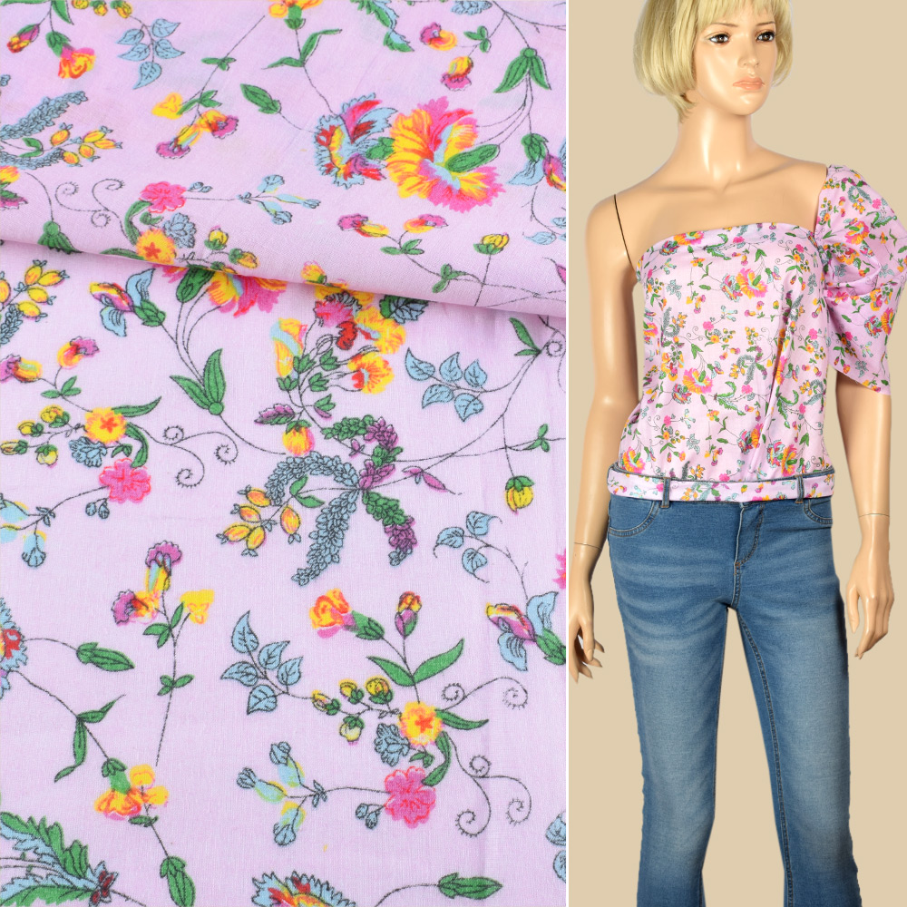 Батист рожевий, рожево-жовті квіти, кучеряві гілки, ш.140. Склад тканини: Бавовна-100. Щільність тканини 63 г/м.кв. Країна виробник: Південна Корея. Будучи легким та пластичним, матеріал у той же час міцний. Є чудовою заміною шифону з шовку, який складний і примхливий у шитті. У спекотний час в одязі з батиста буде комфортно, оскільки тканина має відмінну повітропроникність. Тканина приємна при носінні, не викликає подразнення та алергії.