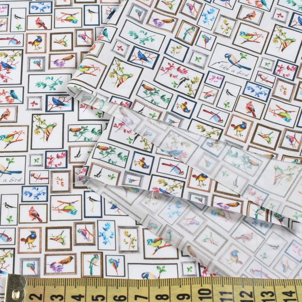 Котон стрейч білий в квадрати з різнокольоровими птахами ш.145 купить в розницу и оптом