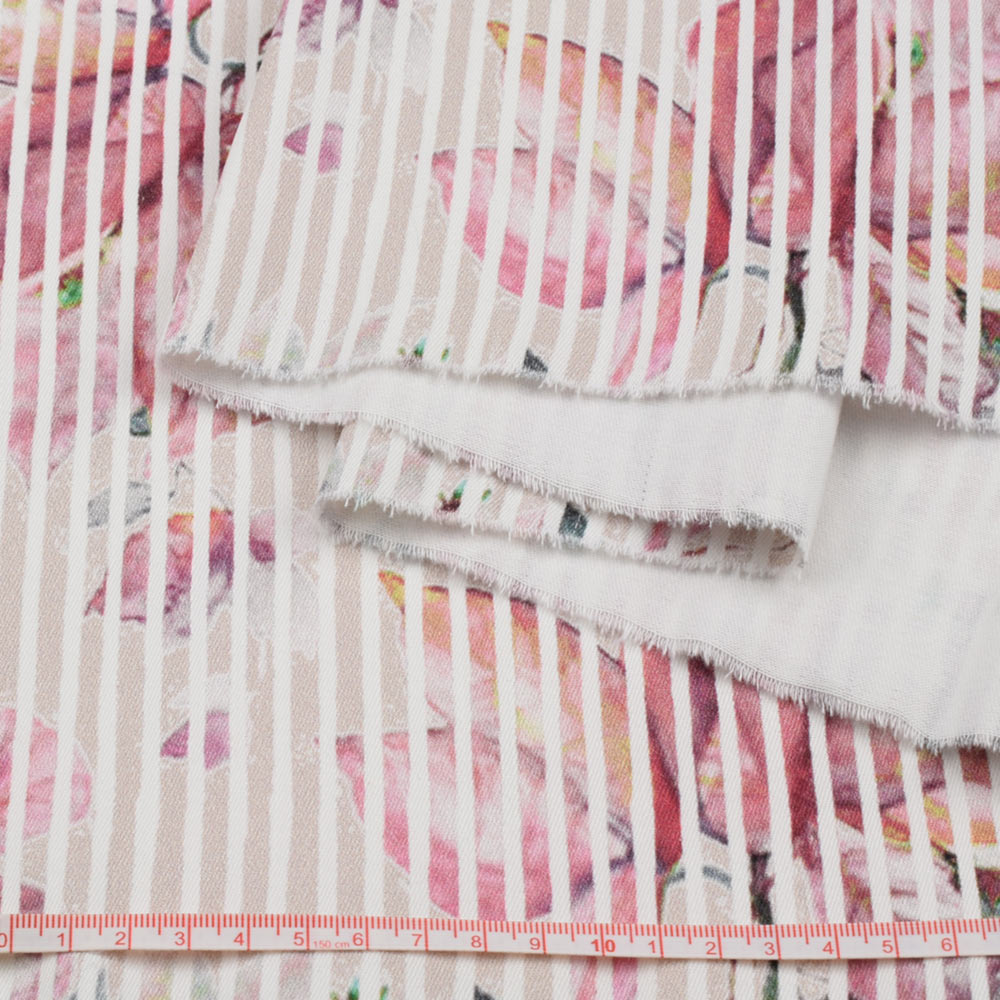 Коттон стрейч APANAGE бежевий, рожеві квіти, біла смужка, ш.128. Склад тканини: Бавовна-94, Еластан-6. Щільність тканини 261 г/м.кв. Країна виробник: Німеччина. Коттон - міцний, легкий, м'який матеріал, він легко вбирає вологу, добре пропускає повітря, має високу теплопровідність.