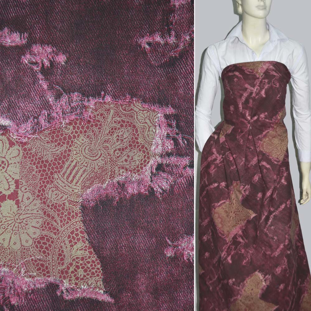 Котон стрейч бордово-бежевий з абстрактним малюнком ш.127. Склад тканини: Бавовна-98, Еластан-2. Щільність тканини 295 г/м.кв. Країна виробник: Німеччина. Коттон - міцний, легкий, м'який матеріал, він легко вбирає вологу, добре пропускає повітря, має високу теплопровідність.