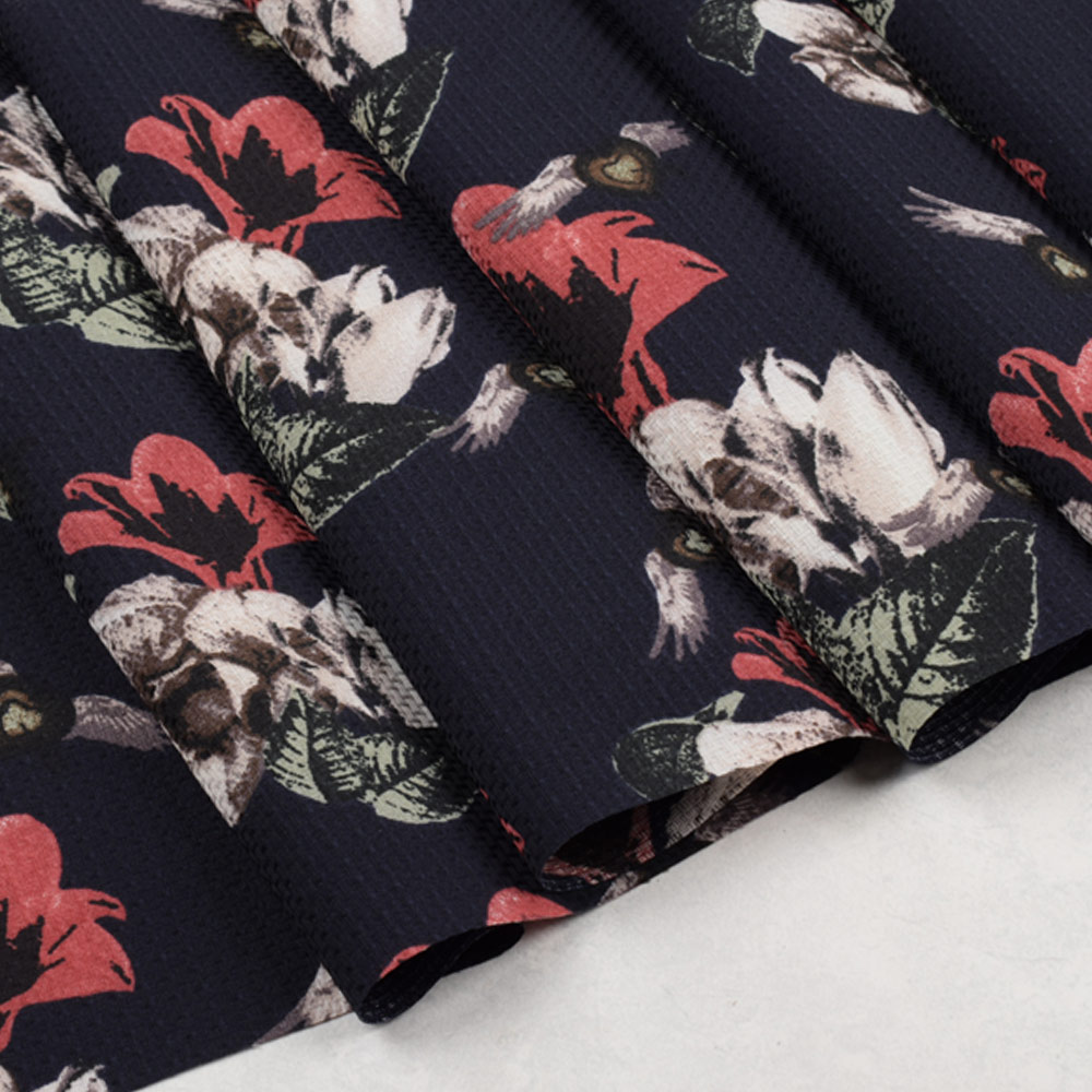 Креп синій темний, бежеві, теракотові квіти, ш.145. Склад тканини: Поліестер-100. Щільність тканини 136 г/м.кв. Країна виробник: Південна Корея. Лицьова сторона матерії має виражений рельєфний малюнок, а виворітна може бути гладкою і дуже приємною до тіла або аналогічною з лицьової. Гарний шорсткий візерунок утворюється завдяки унікальному плетиву ниток полотна. Вироби з цієї матерії ідеально сідають по фігурі. Кріп практично не меніться, стійкий до зносу і практичний. Стрейч-креп добре тканина, що добре тягнеться, яка чудово відновлює форму. Дані властивості дозволяють використовувати креп стрейч для виготовлення різноманітного одягу.Дякуємо за ваш вибір.