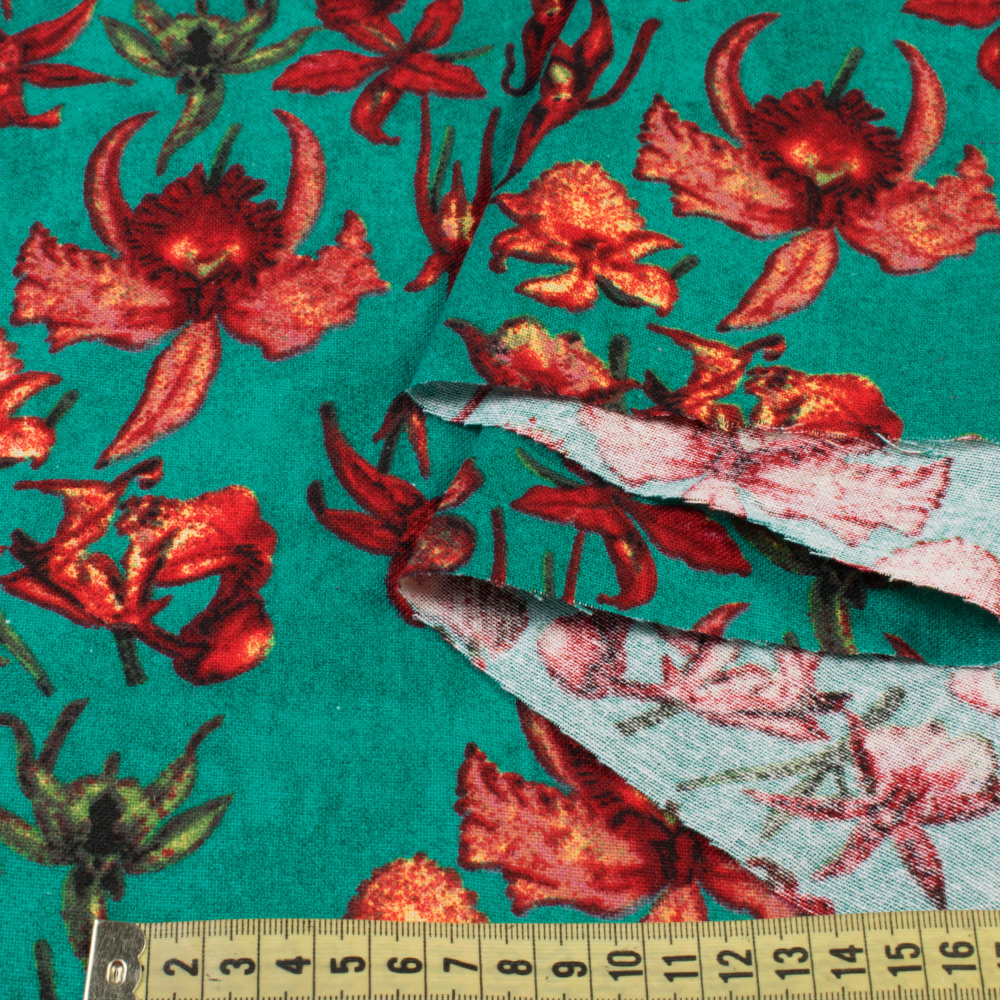 Льон бірюзовий в червоно-помаранчеві орхідеї, ш.145 купить в розницу и оптом