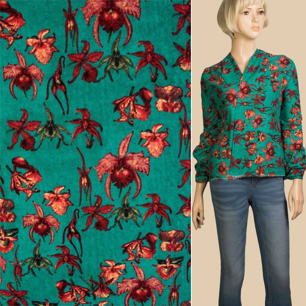 Льон бірюзовий в червоно-помаранчеві орхідеї, ш.145. Склад тканини: Льон-70, Бавовна-30. Щільність тканини 135 г/м.кв. Країна виробник: Південна Корея. Льон – матеріал середньої щільності, натурального походження, використовується для пошиття літніх виробів. Гігроскопічний, повітропроникний, міцний, стійкий до носіння, прання та прасування. Поверхня тканини матова, а завдяки бавовні у складі, тактильно дуже м'яка та приємна на дотик, непрозора. У складках та складаннях не має значного формоутворення, лягає м'яко та пластично. Підходить для пошиття брючних костюмів вільного крою, піджаків, суконь, спідниць, сарафанів, сорочок.Дякуємо за ваш вибір.