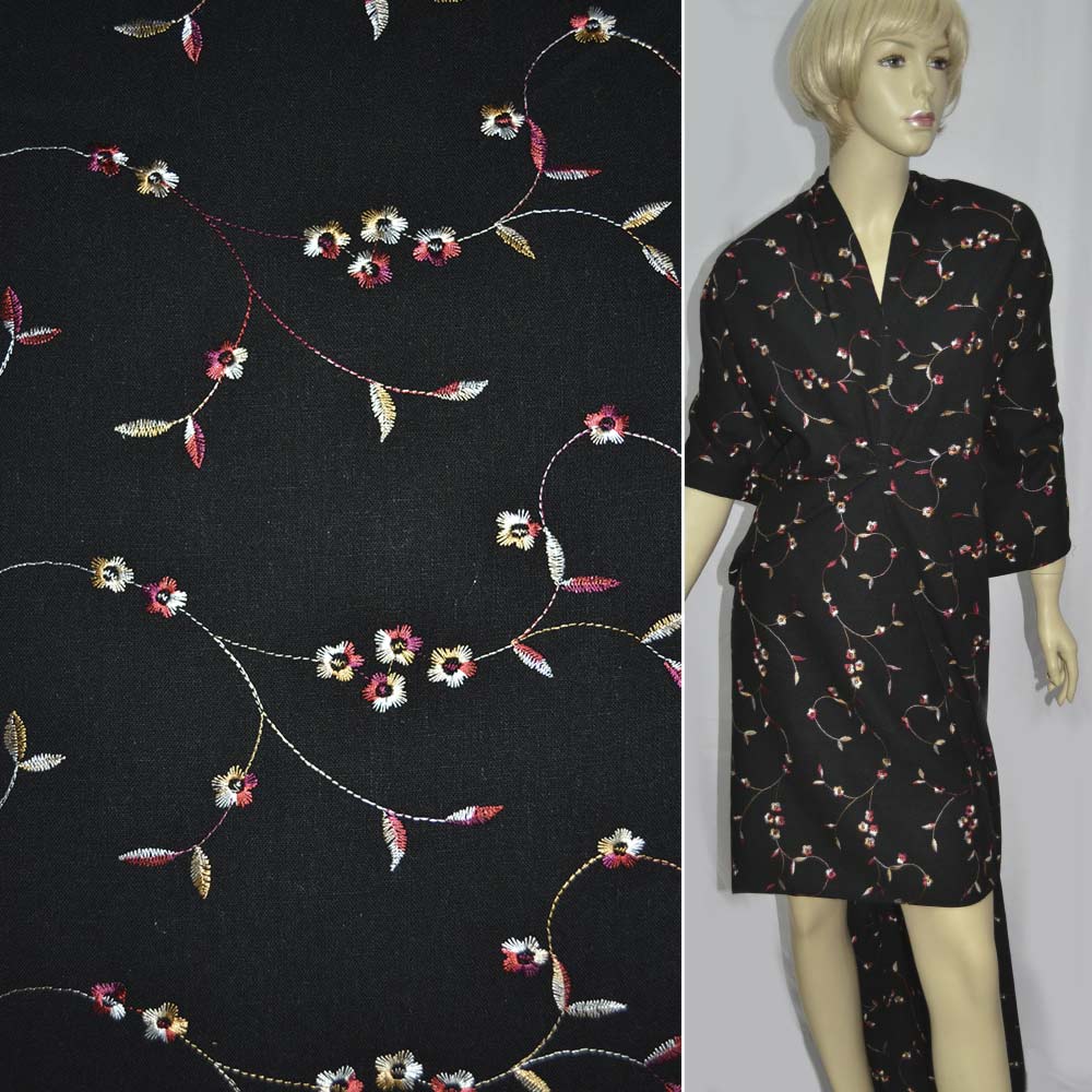 Льон чорний з вишивкою квіти ш.150. Склад тканини: Льон-70, Бавовна-30. Щільність тканини 210 г/м.кв. Країна виробник: Південна Корея. Льон – матеріал середньої щільності, натурального походження, використовується для пошиття літніх виробів. Гігроскопічний, повітропроникний, міцний, стійкий до носіння, прання та прасування. Поверхня тканини матова, а завдяки бавовні у складі, тактильно дуже м'яка та приємна на дотик, непрозора. У складках та складаннях не має значного формоутворення, лягає м'яко та пластично. Підходить для пошиття брючних костюмів вільного крою, піджаків, суконь, спідниць, сарафанів, сорочок.Дякуємо за ваш вибір.