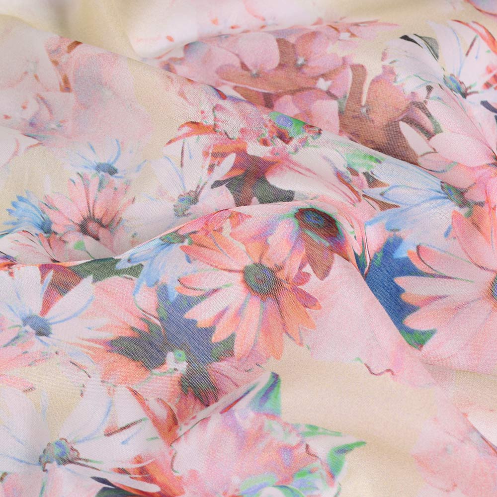 Батист шовковий "Apanage" блідо-жовтий купон в рожево-блакитні квіти ш.133 купить в розницу и оптом