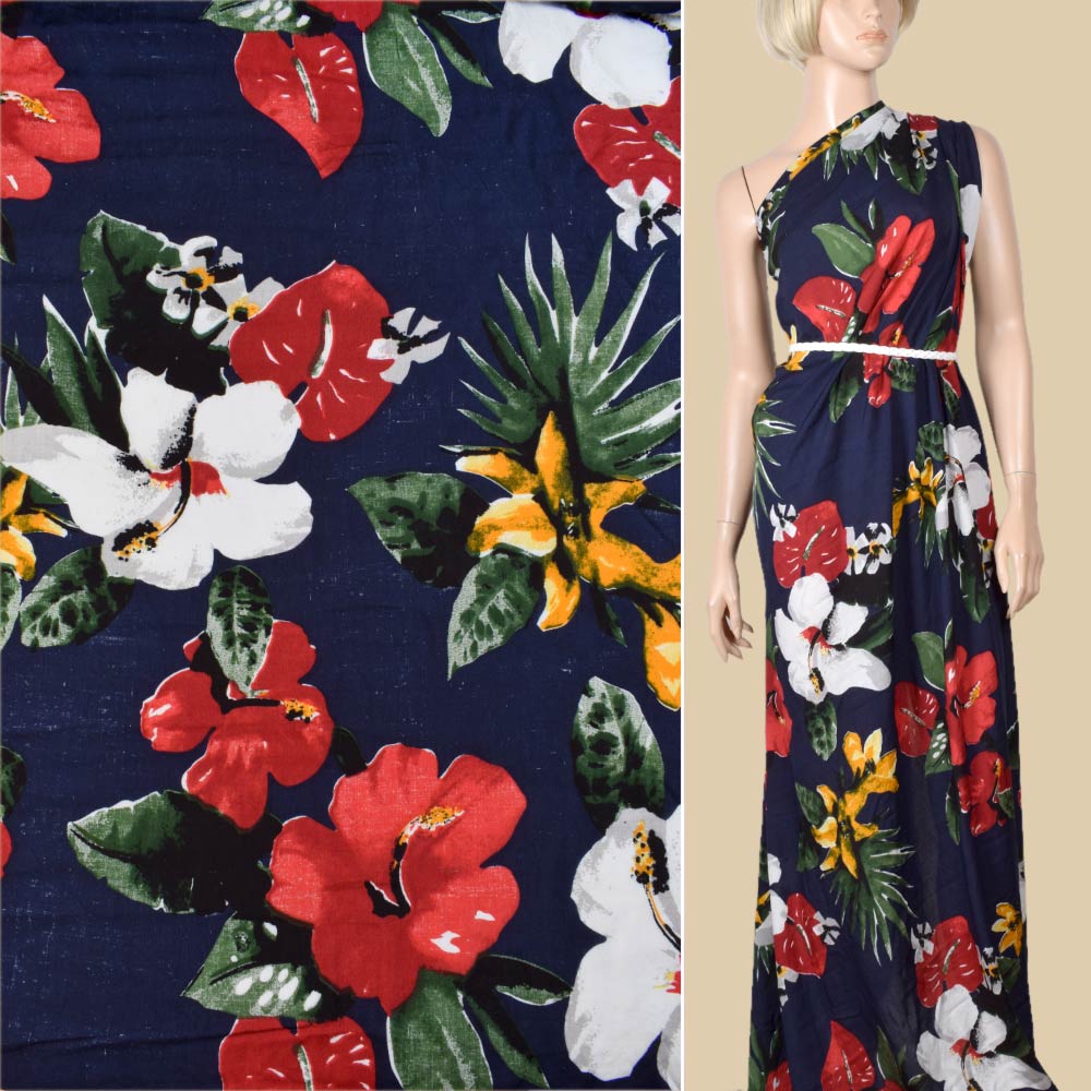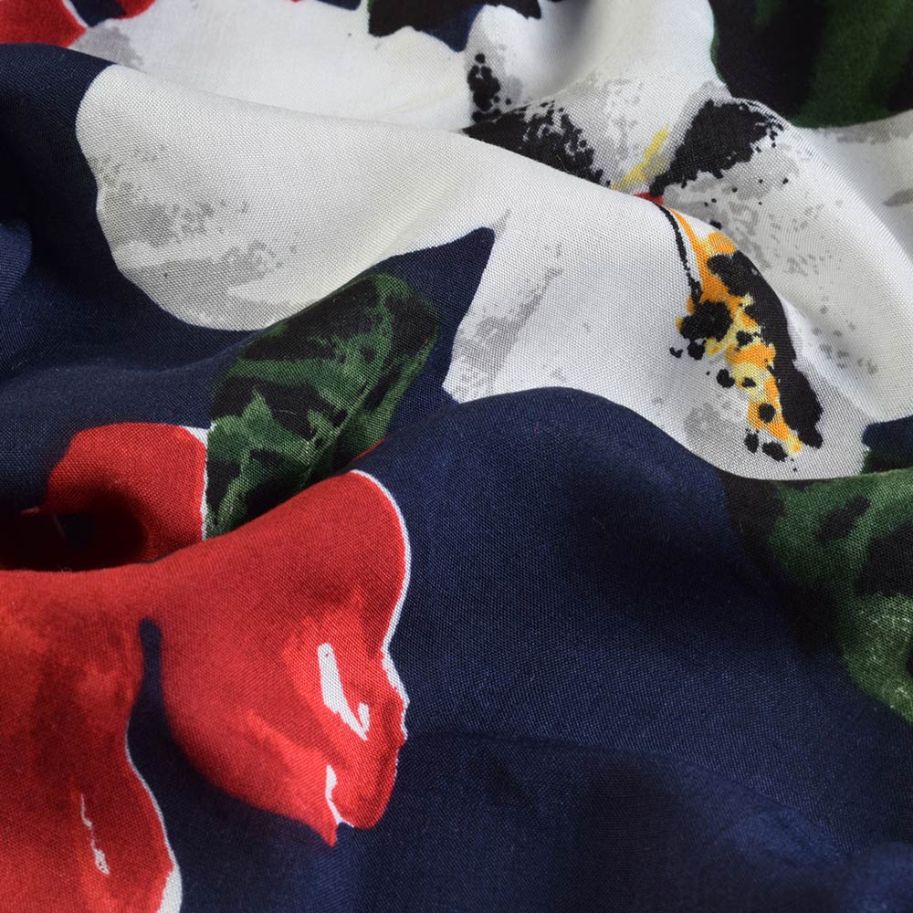 Віскоза * синя в червоні, білі, жовті квіти, ш.150. Склад тканини: Віскоза-100. Щільність тканини 95 г/м.кв. Країна виробник: Південна Корея. Віскоза – це досить цікавий матеріал, тим, що він може бути схожим на шовк, шерсть чи льон. Тканина, яка виходить з віскози дуже приємна та м'яка на дотик, утворює на виробах гарні складки. Через свою досить високу гігроскопічність, віскоза здатна вбрати багато вологи, так, наприклад, в порівнянні з бавовною, вона вбирає її в два рази більше. З віскозного полотна шиють одяг, тому що "нетканка" вбирає вологу і "дихає", при цьому ніколи не викликає алергію. Найчастіше з віскози шиють підкладки для одягу. У домашньому господарстві можна часто зустріти віскозну постільну білизну, скатертини, штори.