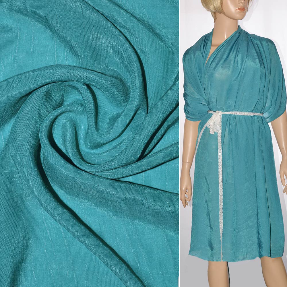 Віскоза бірюзова ш.150. Склад тканини: Віскоза-100. Щільність тканини 82 г/м.кв. Країна виробник: Південна Корея. Полотно з віскози відрізняється м'якістю та легкістю, воно ніжне на дотик і привабливе на вигляд. Віскозна тканина в залежності від складу набуває схожості з шовком, вовною, трикотажем, льоном. За допомогою скручених віскозних ниток тчуть міцний шорсткий креп, речі з нього виходять красивими і багатими на вигляд. Така тканина має підвищену зносостійкість. Віскозне полотно використовується для пошиття жіночого одягу. З неї виходять легкі, майже невагомі блузки, сукні та спідниці для літа. Речі красиво облягають фігуру, не виходять із моди багато років. Цікаві моделі виставляються на модних показах. Популярність та затребуваність віскози важко переоцінити. Вона застосовується у масовому виробництві дитячого та домашнього одягу – халатів, піжам.Дякуємо за ваш вибір.
