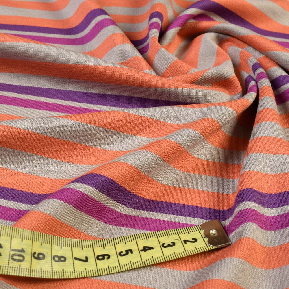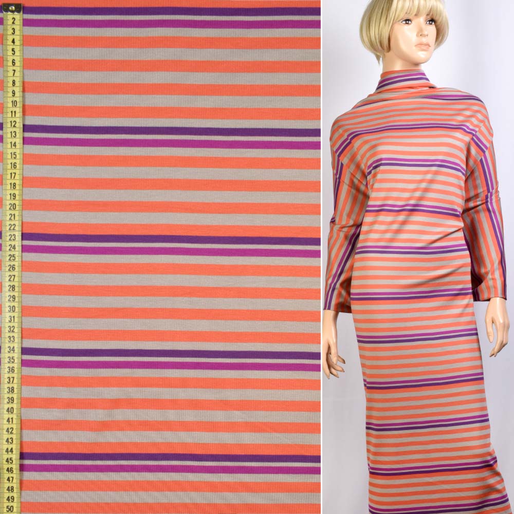 Трикотаж з віскозою стрейч в смужки бежеві, помаранчеві, фіолетові, ш.152 купить в розницу и оптом