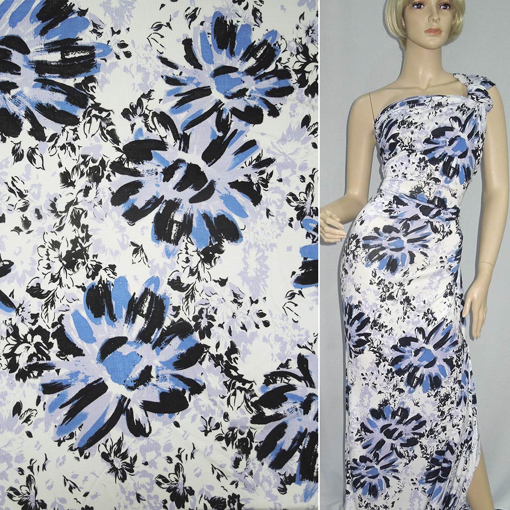 Трикотаж віскозний стрейч білий з квітами чорно-бузковими ш.140 купить в розницу и оптом
