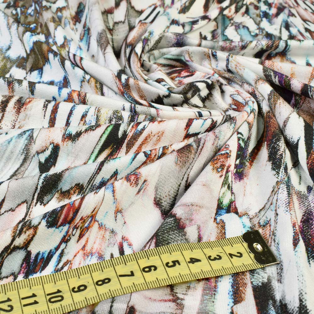 Трикотаж віскозний стрейч білий в різнокольоровий абстрактний малюнок, ш.150. Склад тканини: Віскоза-96, Еластан-4. Щільність тканини 201 г/м.кв. Країна виробник: Німеччина. Трикотаж – це м'яка щільна матерія, не прозора. Приємна на дотик, комфортна в носінні. Завдяки вмісту синтетичних матерій, матеріал більш зносостійкий та надовго зберігає свій первісний вигляд. Тканина відрізняється своєю приємною текстурою, гарною розтяжністю, практично не здається. Трикотаж досить простий у догляді. Використовується для пошиття суконь, спортивних костюмів, легких жакетів, поло, футболок та багато іншого.Дякуємо за ваш вибір.